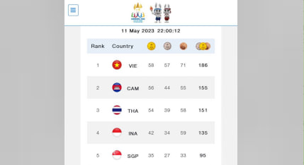 គិតត្រឹមម៉ោង១០៖០០នាទីយប់នេះ កម្ពុជា ទទួលបានមេដាយសរុប ១៥៥គ្រឿង ក្នុងនោះមាសចំនួន៥៦, ប្រាក់ចំនួន៤៤ និងសំរិទ្ធចំនួន៥៥One-Minuteអត្ថបទដោយ៖AMS OneMinute #ams1minute AMS OneMinuteអត្ថបទមុនអត្ថបទបន្ទាប់