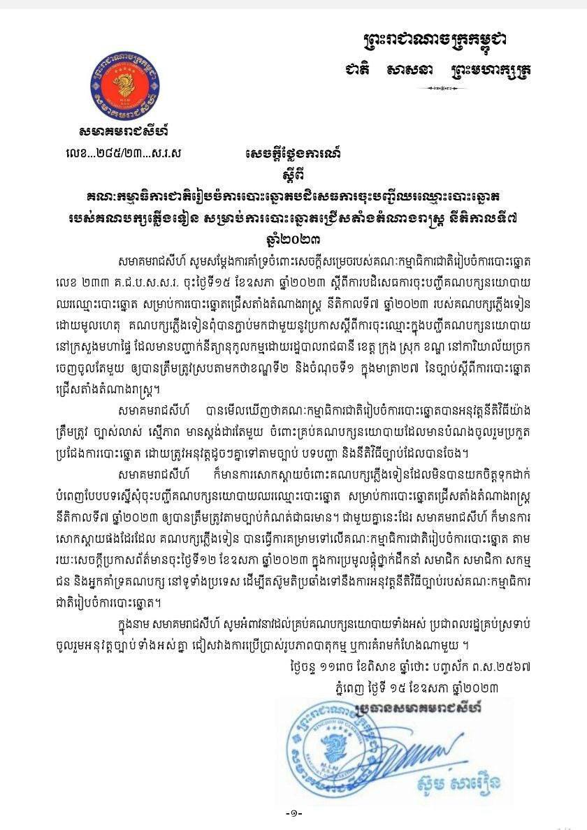 សមាគមរាជសីហ៍ ចេញសេចក្តីថ្លែងការណ៍គាំទ្រចំពោះការសម្រេចរបស់ គ.ជ.ប ដែលបដិសេធការចុះបញ្ជីឈរឈ្មោះបោះឆ្នោតរបស់គណបក្សភ្លើងទៀន