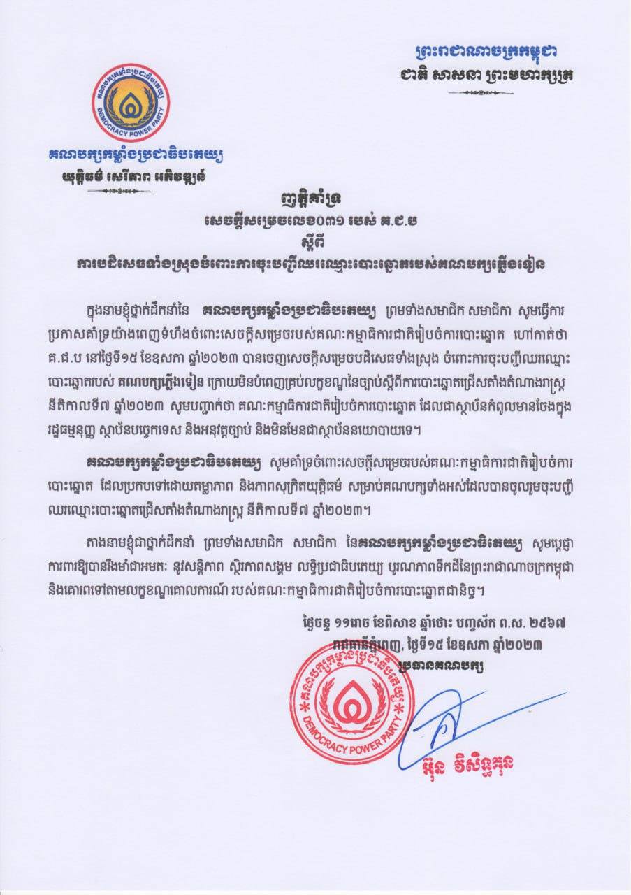 គណបក្សកម្លាំងប្រជាធិបតេយ្យ សូមគាំទ្រចំពោះសេចក្តីសម្រេចរបស់គណៈកម្មាធិការជាតិរៀបចំការបោះឆ្នោត ដែលប្រកបទៅដោយតម្លាភាព និងភាពសុក្រិតយុត្តិធម៌ សម្រាប់គណបក្សទាំងអស់ដែលបានចូលរួមចុះបញ្ជីឈរឈ្មោះបោះឆ្នោតជ្រើសតាំងតំណាងរាស្ត្រ នីតិកាលទី៧ ឆ្នាំ២០២៣។