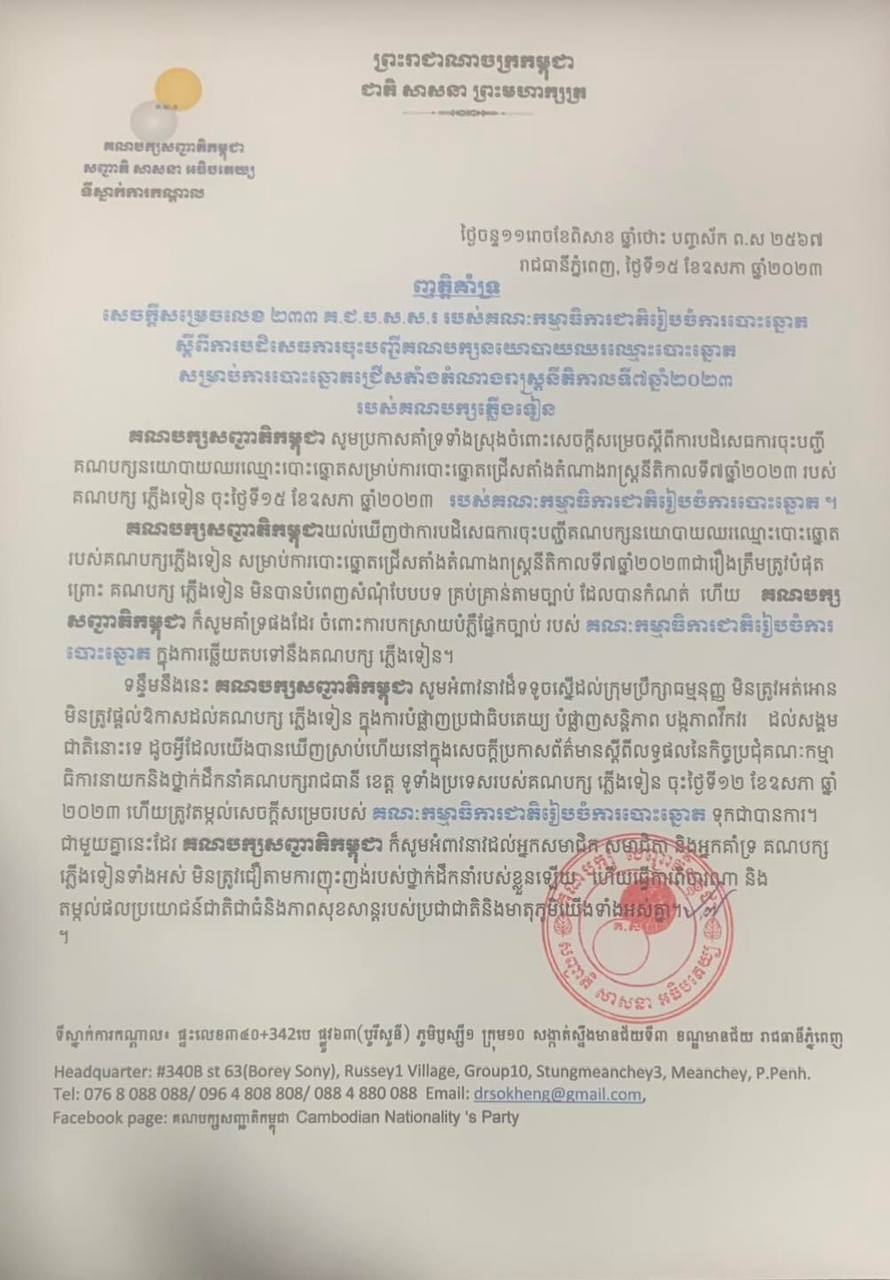 គណបក្សសញ្ជាតិកម្ពុជា គាំទ្រសេចក្តីសម្រេចរបស់ គ.ជ.ប ស្តីពីការបដិសេធការចុះបញ្ជីគណបក្សនយោបាយឈរឈ្មោះបោះឆ្នោតរបស់គណបក្សភ្លើងទៀន