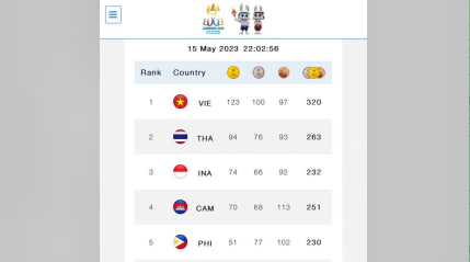 គិតត្រឹមម៉ោង១០៖០២នាទីយប់នេះ កម្ពុជា ទទួលបានមេដាយសរុប ២៥១គ្រឿង ក្នុងនោះមាសចំនួន៧០, ប្រាក់ចំនួន៦៨ និងសំរិទ្ធចំនួន១១៣One-Minuteអត្ថបទដោយ៖AMS OneMinute #ams1minute AMS OneMinuteអត្ថបទមុនអត្ថបទបន្ទាប់