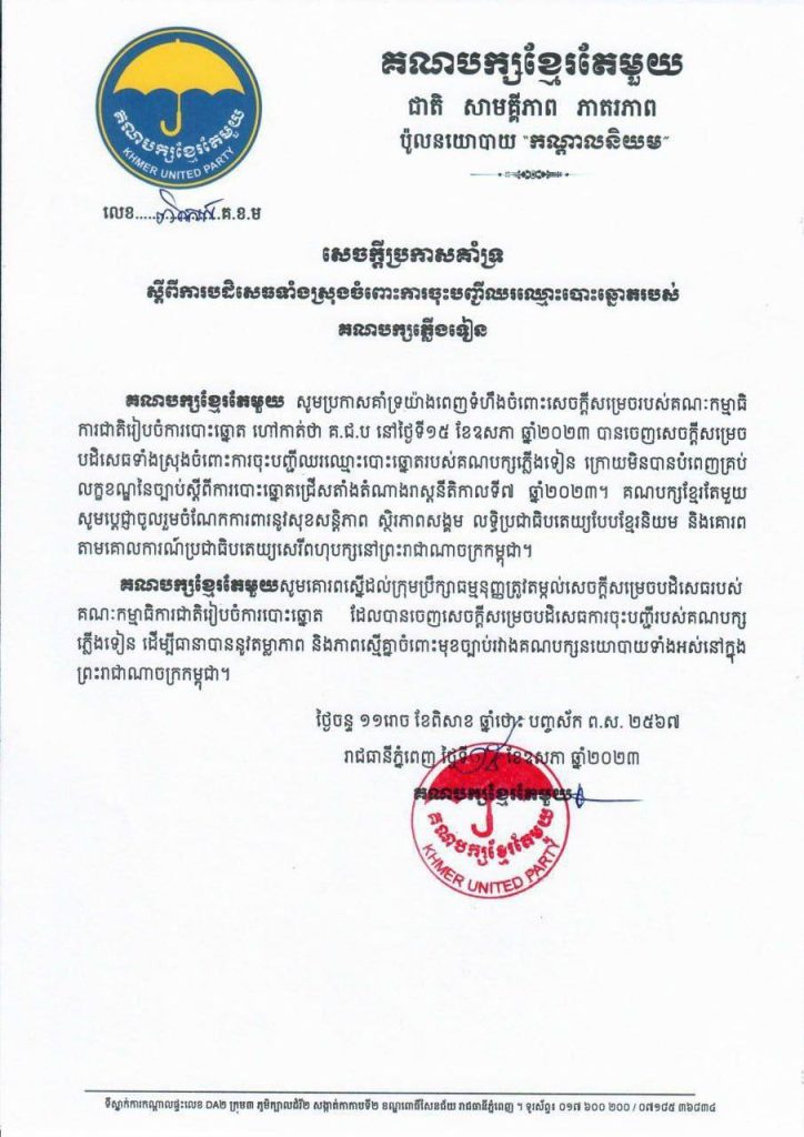 ភ្នំពេញ៖ គណបក្សខ្មែរតែមួយ បានប្រកាសគាំទ្រយ៉ាងពេញទំហឹងចំពោះសេចក្ដីសម្រេចរបស់គណៈកម្មាធិការជាតិរៀបចំការបោះឆ្នោត ហៅកាត់ថា គ.ជប នៅថ្ងៃទី១៥ ខែឧសភា ឆ្នាំ២០២៣ បានចេញសេចក្ដីសម្រេចបដិសេធទាំងស្រុងចំពោះការចុះបញ្ជីឈរឈ្មោះបោះឆ្នោតរបស់គណបក្សភ្លើងទៀន ក្រោយមិនបានបំពេញគ្រប់ លក្ខខណ្ឌនៃច្បាប់ស្តីពីការបោះឆ្នោតជ្រើសតាំងតំណាងរាស្តនីតិកាលទី៧ ឆ្នាំ២០២៣ ។