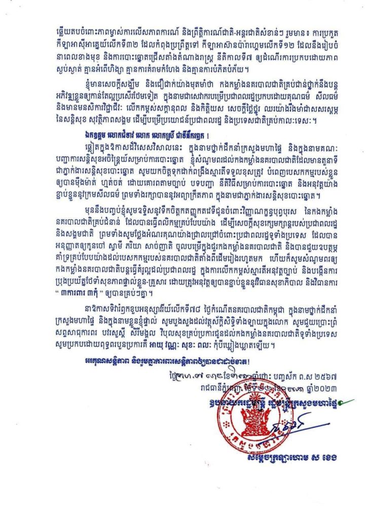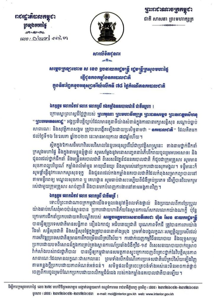 សារលិខិតជូនពរ សម្តេចក្រឡាហោម ស ខេង ផ្ញើជូនកងកម្លាំងនគរបាលជាតិ ក្នុងទិវារំឭកខួបអនុស្សាវរីយ៍លើកទី៧៨ ថ្ងៃកំណើតនគរបាលជាតិ (១៦ ឧសភា ១៩៤៥ – ១៦ ឧសភា ២០២៣)One-Minuteអត្ថបទដោយ៖AMS OneMinute #ams1minute AMS OneMinuteអត្ថបទមុនអត្ថបទបន្ទាប់