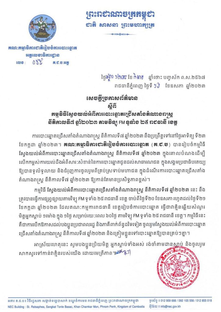 សេចក្តីប្រកាសព័ត៌មាន ស្តីពីកម្មវិធីស្វែងយល់អំពីការបោះឆ្នោតជ្រើសតាំងតំណាងរាស្ត្រ នីតិកាលទី៧ ឆ្នាំ២០២៣ តាមវិទ្យុ FM ទូទាំង ២៥ រាជធានី ខេត្តOne-Minuteបោះឆ្នោតសកល ២០២៣អត្ថបទដោយ៖AMS OneMinute #ams1minute #បោះឆ្នោត២០២៣ #khelection2023 AMS OneMinuteអត្ថបទមុនអត្ថបទបន្ទាប់