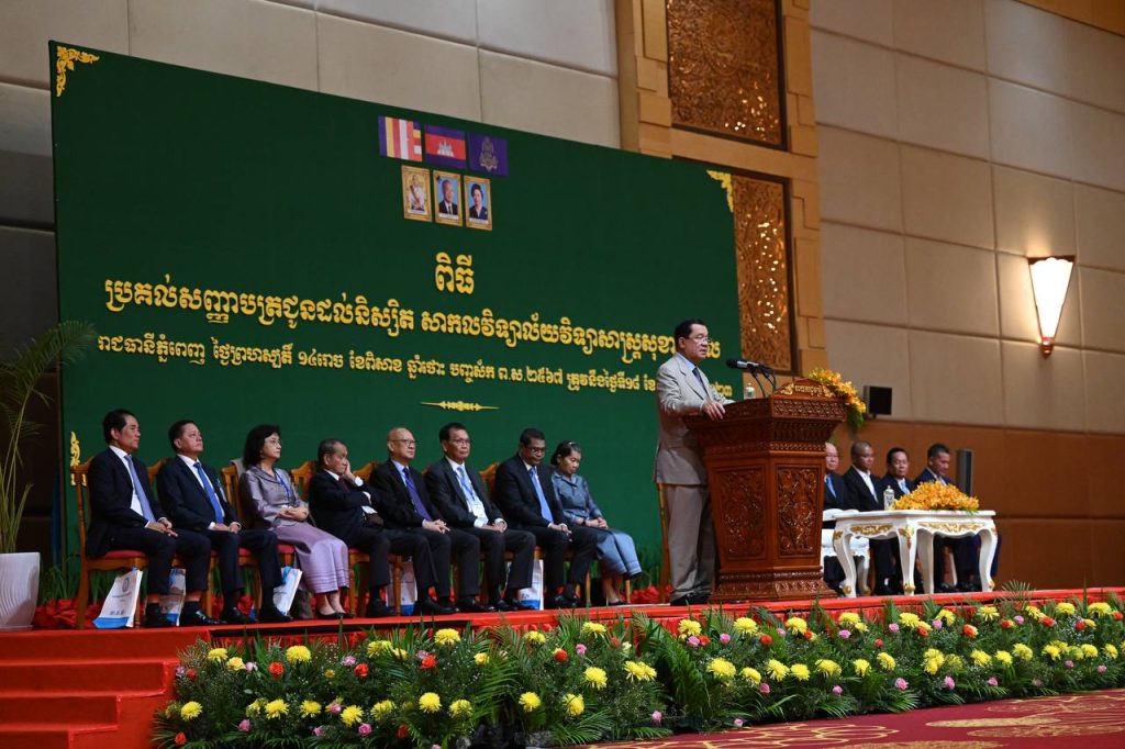 ភ្នំពេញ ៖ ក្នុងពិធីប្រគល់សញ្ញាបត្រដល់និស្សិតពេទ្យបញ្ចប់ការសិក្សាពីសាកលវិទ្យាល័យវិទ្យាសាស្ត្រសុខាភិបាល (University of Health Science) ចំនួនជាង១ពាន់នាក់ ដែលធ្វើឡើងនៅសណ្ឋាគារសុខាភ្នំពេញ នាព្រឹកថ្ងៃទី១៨ ខែឧសភា ឆ្នាំ២០២៣ សម្តេចតេជោ ហ៊ុន សែន បានរំលឹកសារជាថ្មីម្តងទៀត ពីកម្ពុជាបានឆ្លងកាត់វាល៣ ។