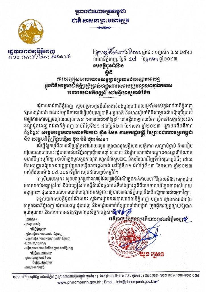 ដើម្បីឱ្យកម្មវិធីខាងលើប្រព្រឹត្តទៅដោយរលូន រក្សាបាននូវសន្តិសុខ សុវត្ថិភាព សណ្តាប់ធ្នាប់ និងរបៀបរៀបរយសាធារណៈ រដ្ឋបាលរាជធានីភ្នំពេញធ្វើការបញ្ចៀសចរាចរ និងផ្អាកចរាចរជាបណ្ដោះអាសន្នលើកំណាត់ មហាវិថីព្រះមុនីវង្ស ចាប់ពីរង្វង់មូលកួចកាណុង រហូតដល់ស្តុបBKC និងបរិវេណជុំវិញទីតាំងប្រារព្ធពិធី ដោយមិនអនុញ្ញាតឱ្យយានយន្តគ្រប់ប្រភេទធ្វើចរាចរឆ្លងកាត់ នៅថ្ងៃទី២១ ដល់ថ្ងៃទី២៣ ខែឧសភា ឆ្នាំ២០២៣ ចាប់ពីវេលាម៉ោង ០៥:០០នាទីព្រឹក រហូតដល់បញ្ចប់កម្មវិធី ។