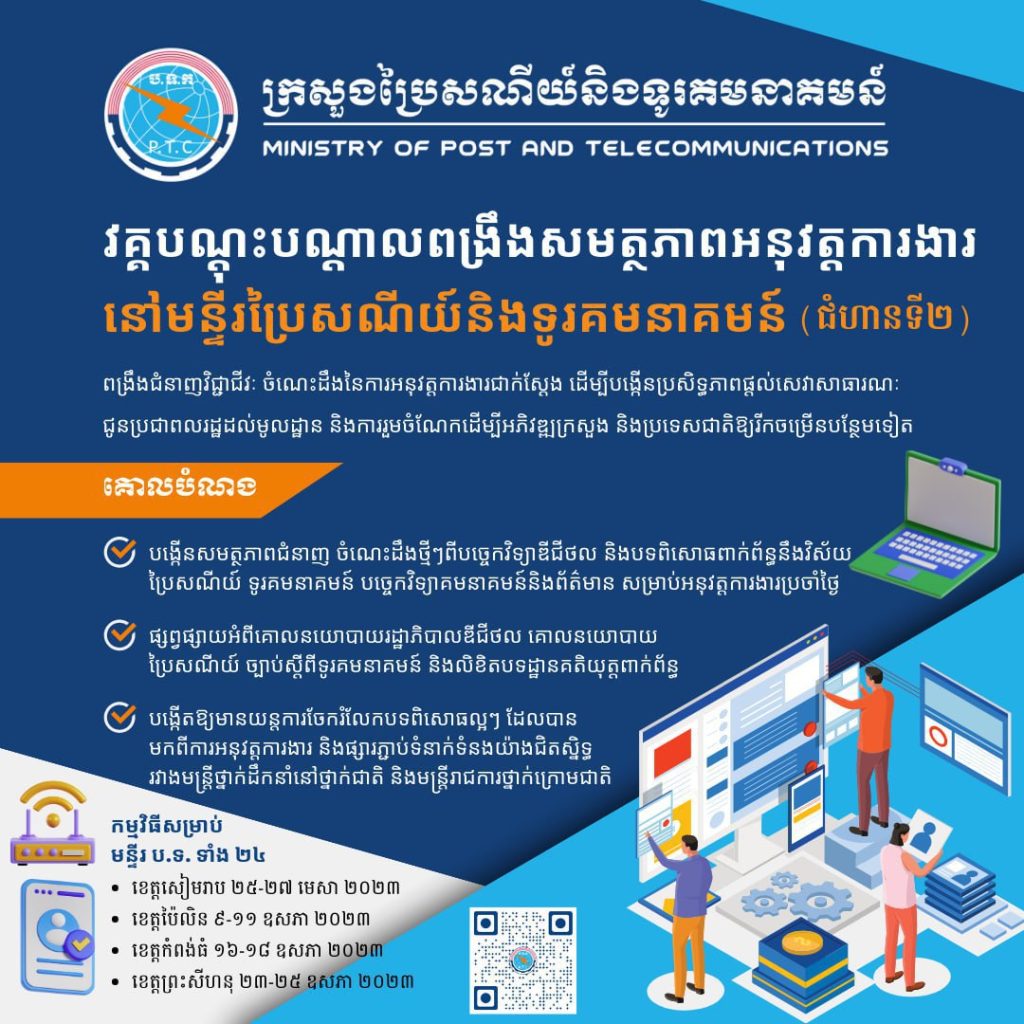 សូមជម្រាបជូនថា កម្មវិធីបណ្តុះបណ្ដាលស្ដីពីការពង្រឹងសមត្ថភាពអនុវត្តការងារនៅមន្ទីរប្រៃសណីយ៍និងទូរគមនាគមន៍ (ជំហានទី២) សម្រាប់មន្ទីរ ប.ទ. ទាំង ២៤ បាននិងកំពុងរៀបចំ ចាប់ពីថ្ងៃទី២៥ ខែមេសា រហូតដល់ថ្ងៃទី២៥ ខែឧសភា ឆ្នាំ២០២៣ ដែលធ្វើនៅ ៤ទីតាំង ដូចខាងក្រោម ៖
