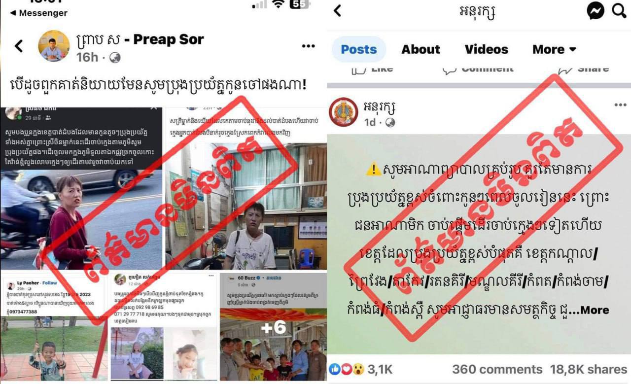 ការផ្សព្វផ្សាយព័ត៌មានតាមបណ្ដាញសង្គមថា មានករណីចាប់ក្មេងៗ ឬការចាប់ក្មេងវះក្រលៀន គឺជាព័ត៌មាន ក្លែងក្លាយ