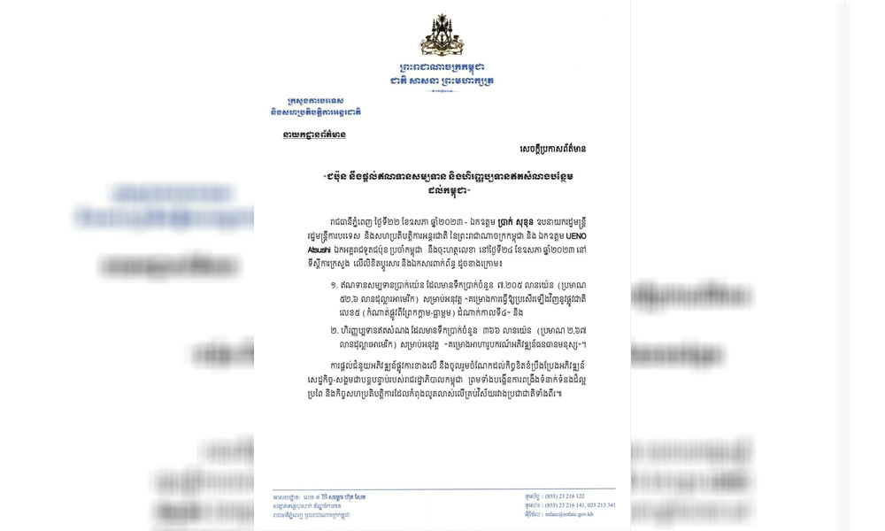 ភ្នំពេញ៖ យោងតាមសេចក្តីប្រកាសព័ត៌មានក្រសួងការបរទេស និងសហប្រតិបត្តិការអន្តរជាតិ ដែលទទួលបាននៅថ្ងៃទី២២ ខែឧសភា ឆ្នាំ២០២៣ ឯកឧត្តម ប្រាក់ សុខុន ឧបនាយករដ្ឋមន្ត្រី រដ្ឋមន្ត្រីការបរទេស និងសហប្រតិបត្តិការអន្តរជាតិ នៃព្រះរាជាណាចក្រកម្ពុជា និង ឯកឧត្តម UENO Atsushi ឯកអគ្គរាជទូតជប៉ុនប្រចាំកម្ពុជា នឹងចុះហត្ថលេខា លើលិខិតប្ដូរសារ និងឯកសារពាក់ព័ន្ធ នាថ្ងៃទី២៤ ខែឧសភា ឆ្នាំ២០២៣ នៅទីស្ដីការក្រសួង ។