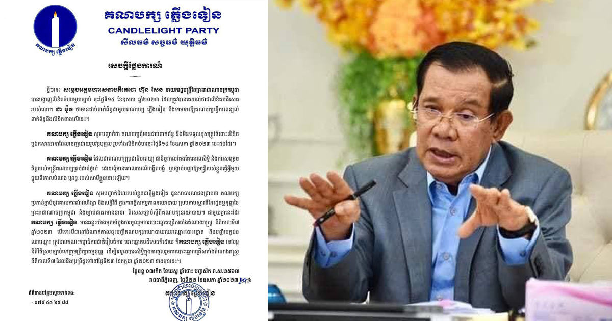 ភ្នំពេញ៖ សម្តេចតេជោ ហ៊ុន សែន បានទទួលយកការបំភ្លឺរបស់គណបក្សភ្លើងទៀន តាមរយៈសេចក្តីថ្លែងការណ៍នៅថ្ងៃទី២២ ខែឧសភា ឆ្នាំ២០២៣នេះ។ នេះបើតាមការបញ្ជាក់របស់សម្តេចតេជោ ហ៊ុន សែន នៅលើបណ្តាញតេឡាក្រាម នៅយប់ថ្ងៃទី២២ ខែឧសភា ឆ្នាំ២០២៣។