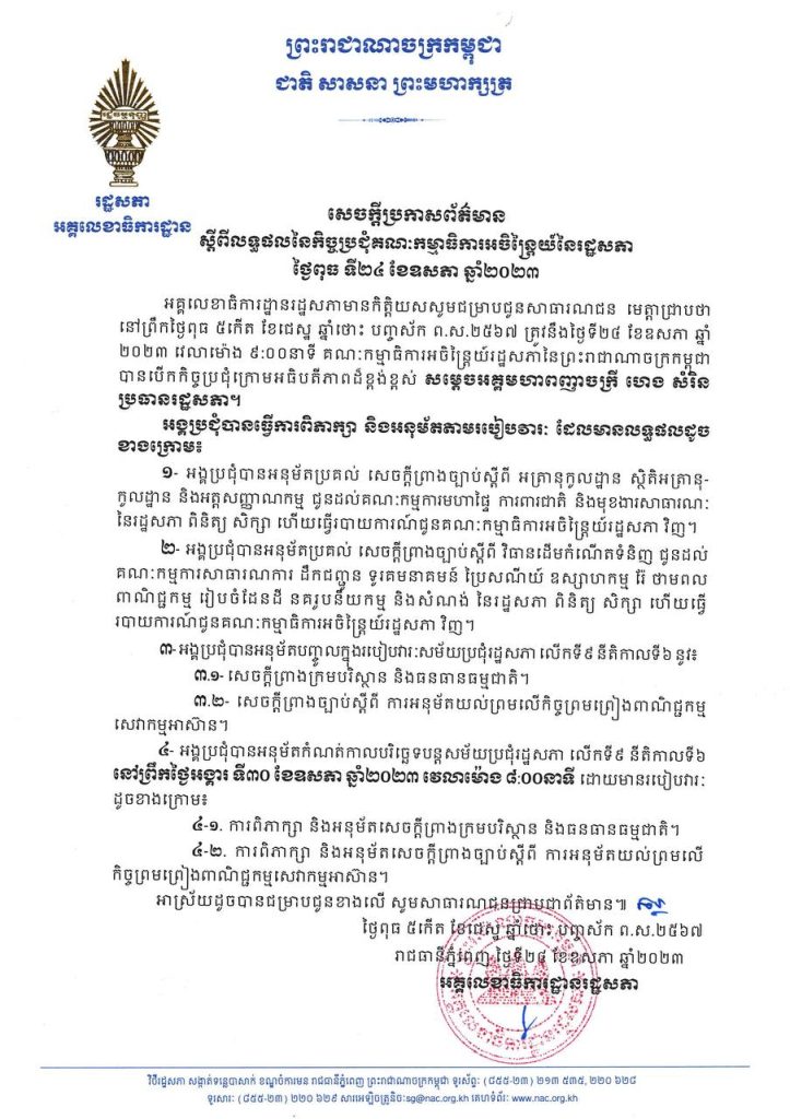 ភ្នំពេញ៖ គណៈកម្មាធិកាអចិន្រ្តៃយ៍រដ្ឋសភា បានកំណត់យកថ្ងៃ៣០ ខែឧសភា ឆ្នាំ២០២៣ ប្រជុំរដ្ឋសភាដើម្បីពិភាក្សាអនុម័តសេចក្តីព្រាងក្រមបរិស្ថាននិងធនធានធម្មជាតិ និងសេចក្តីព្រាងច្បាប់ស្តីពី ការអនុម័តយល់ព្រមលើកិច្ចព្រមព្រៀងពាណិជ្ជកម្មអាស៊ាន និងបានទទួលយកសេចក្តីព្រាងច្បាប់ពីរទៀត គឺ សេចក្តីព្រាងច្បាប់ស្តីពីអត្រានុកូលដ្ឋាន ស្ថិតិអត្រានុកូលដ្ឋាន និងអត្តសញ្ញាណកម្ម និងសេចក្តីព្រាងច្បាប់ស្តីពីវិធានដើមកំណើតទំនិញ ប្រគល់ជូនគណៈកម្មាជំនាញរដ្ឋសភាពិនិត្យសិក្សាផងដែរ។