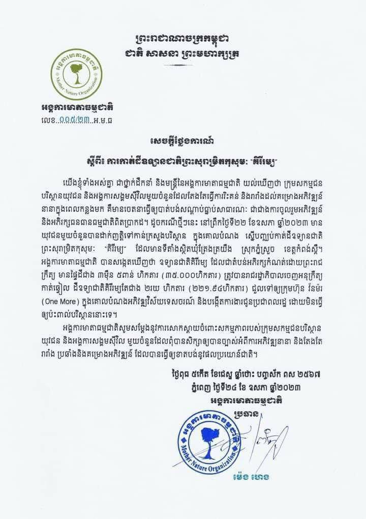 អង្គការមាតាធម្មជាតិ បានសង្កេតឃើញថា ឧទ្យានជាតិគិរីរម្យ ដែលជាតំបន់អភិរក្សកំណត់ដោយព្រះរាជករឹត្យ មានផ្ទៃដីជាង៣ម៉ឺន៥ពាន់ហិកតា (៣៥,០០០ហិកតា) ត្រូវបានរាជរដ្ឋាភិបាលចេញអនុក្រឹត្យកាត់ឆ្កៀលដីឧទ្យាជាតិគិរីរម្យតែជាង២រយហិកតា (២២១.៩៤ហិកតា) ជួលទៅឱ្យក្រុមហ៊ុន វ៉នម៉រ (One More) ក្នុងគោលបំណងអភិវឌ្ឍវិស័យទេសចរណ៍ និងបង្កើតការងារជូនប្រជាពលរដ្ឋ ដោយមិនធ្វើឱ្យប៉ះពាល់បរិស្ថាននោះទេ។ អង្គការមាតាធម្មជាតិ បានសម្តែងនូវការសោកស្តាយចំពោះសកម្មភាពរបស់ក្រុមសកម្មជនបរិស្ថាន យុវជន និងអង្គការសង្គមស៊ីវិល មួយចំនួនដែលពុំបានសិក្សាឱ្យបានច្បាស់អំពីការអភិវឌ្ឍនានា និងតែងតែរារាំង ប្រឆាំងនឹងគម្រោងអភិវឌ្ឍន៍ដែលបានធ្វើឱ្យខាតបង់នូវផលប្រយោន៍ជាតិ៕