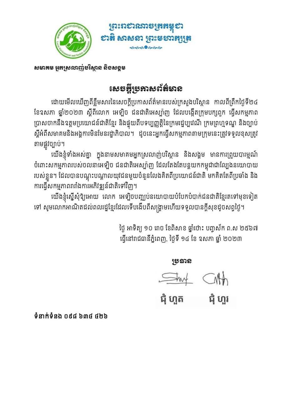 សេចក្តីប្រកាសព័ត៌មានបានបន្តថា “យើងខ្ញុំទាំងអស់គ្នា ក្នុងនាមសមាគមអ្នកស្រលាញ់បរិស្ថាននិងសង្គម មានការព្រួយបារម្ភចំពោះសកម្មភាពរបស់ចលនាអេឡិច ជនជាតិអេស្ប៉ាញ ដែលតែងតែបន្តយកកម្ពុជាជាល្បែងនយោបាយរបស់ខ្លួន ដែលបានបណ្តុះបណ្តាលយុវជនមួយចំនួនលែងគិតពីប្រយោជន៍ជាតិ មកគិតតែពីប្រឆាំង និងការធ្វើសកម្មភាពរារាំងការអភិវឌ្ឍន៍ជាតិទៅវិញ។”