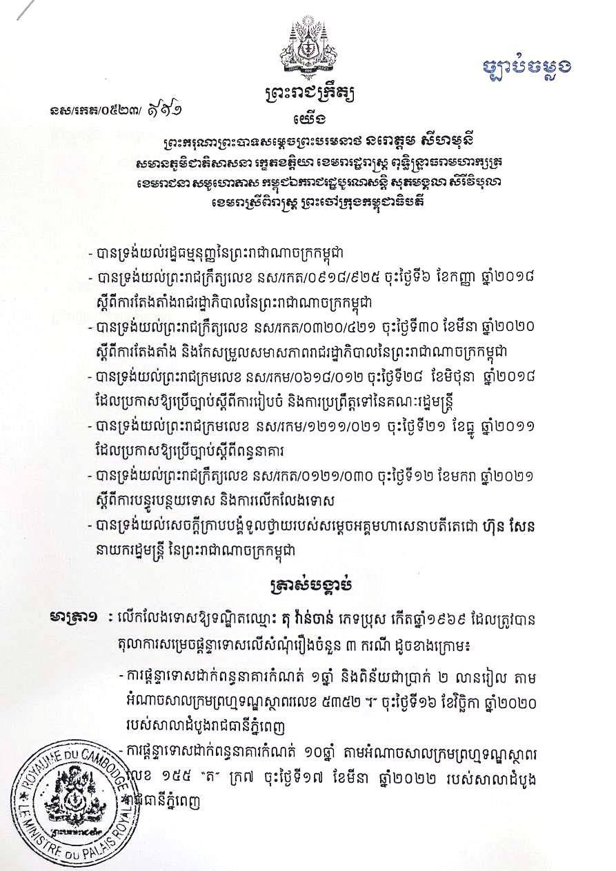 ព្រះមហាក្សត្រចេញព្រះរាជក្រឹត្យលើកលែងទោសឱ្យទណ្ឌិត តុ វ៉ាន់ចាន់ អតីតតំណាងរាស្ត្របក្សប្រឆាំង