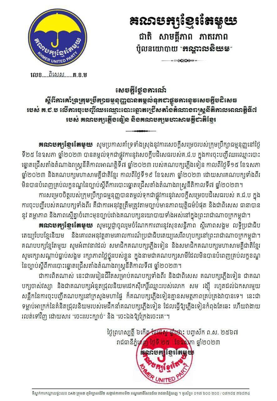 ភ្នំពេញ៖គណបក្សខ្មែរតែមួយបានប្រកាសគាំទ្រចំពោះការសម្រេចរបស់ក្រុមប្រឹក្សាធម្មនុញ្ញក្នុងការបដិសេធចោល បណ្តឹងតវ៉ារបស់គណបក្សភ្លើងទៀននិងគណបក្សមហាសាមគ្គីជាតិខ្មែរ ដោយបានអះអាងថាការសម្រេចរបស់ក្រុមប្រឹក្សា ធម្មនុញ្ញ គឺបង្ហាញអំពីភាពត្រឹមត្រូវនៃការអនុវត្តច្បាប់។នេះបើយោងតាមសេចក្តីថ្លែងការណ៍នៅថ្ងៃទី២៥ ខែឧសភា ឆ្នាំ២០២៣នេះ ៕