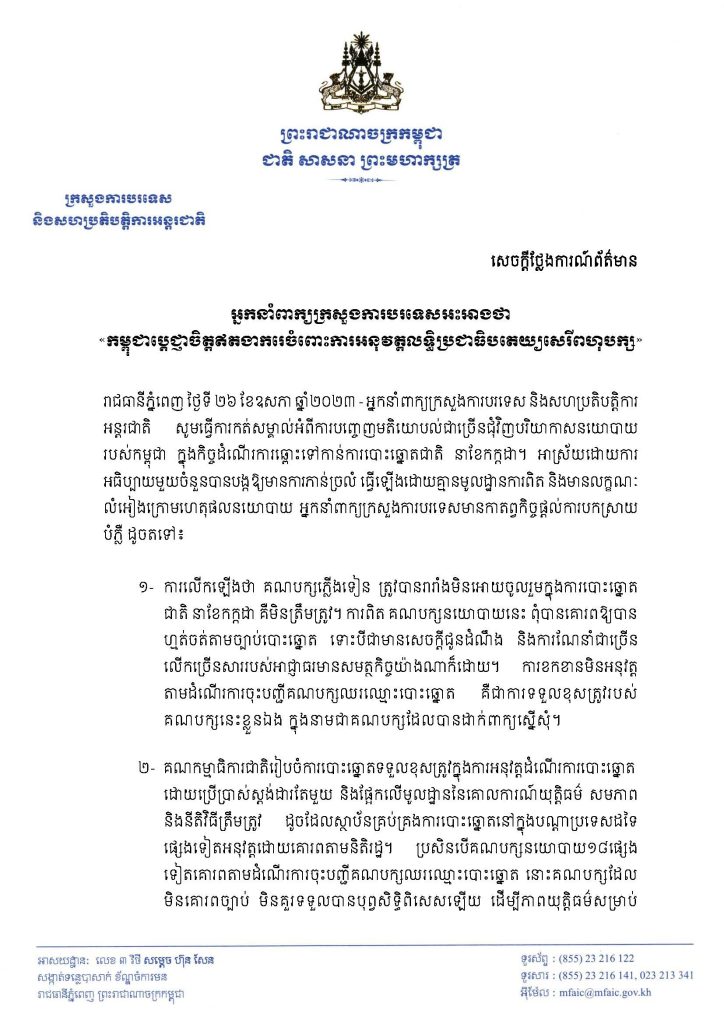 ភ្នំពេញ៖ អ្នកនាំពាក្យក្រសួងការបរទេស និងសហប្រតិបត្តិការអន្តរជាតិ សូមធ្វើការកត់សម្គាល់អំពីការបញ្ចេញមតិយោបល់ជាច្រើនជុំវិញបរិយាកាសនយោបាយរបស់កម្ពុជា ក្នុងកិច្ចដំណើរការឆ្ពោះទៅកាន់ការបោះឆ្នោតជាតិនាខែកក្កដា។ អាស្រ័យដោយការអធិប្បាយមួយចំនួនបានបង្កឱ្យមានការភាន់ច្រលំ ធ្វើឡើងដោយគ្មានមូលដ្ឋានការពិត និងមានលក្ខណៈលំអៀងក្រោមហេតុផលនយោបាយ អ្នកនាំពាក្យក្រសួងការបរទេសមានកាតព្វកិច្ចផ្តល់ការបកស្រាយបំភ្លឺ ដូចតទៅ៖