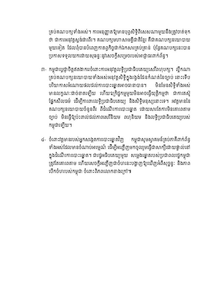 ៤-ចំពោះវត្តមានរបស់អ្នកសង្កេតការបោះឆ្នោតវិញ កម្ពុជាសូមស្វាគមន៍គ្រប់ភាគីពាក់ព័ន្ធទាំងអស់ដែលមានចំណាប់អារម្មណ៍ ដើម្បីអញ្ជើញមកចូលរួមធ្វើជាសាក្សីដោយផ្ទាល់នៅក្នុងដំណើរការបោះឆ្នោត។ ជារដ្ឋអធិបតេយ្យមួយ សំឡេងឆ្នោតរបស់ប្រជាពលរដ្ឋកម្ពុជាត្រូវតែគោរពតាម ហើយសេចក្តីអញ្ជើញជាចំហនេះបង្ហាញឱ្យឃើញអំពីសុច្ឆន្ទៈ និងភាពបើកចំហរបស់កម្ពុជា ចំពោះពិភពលោកខាងក្រៅ៕