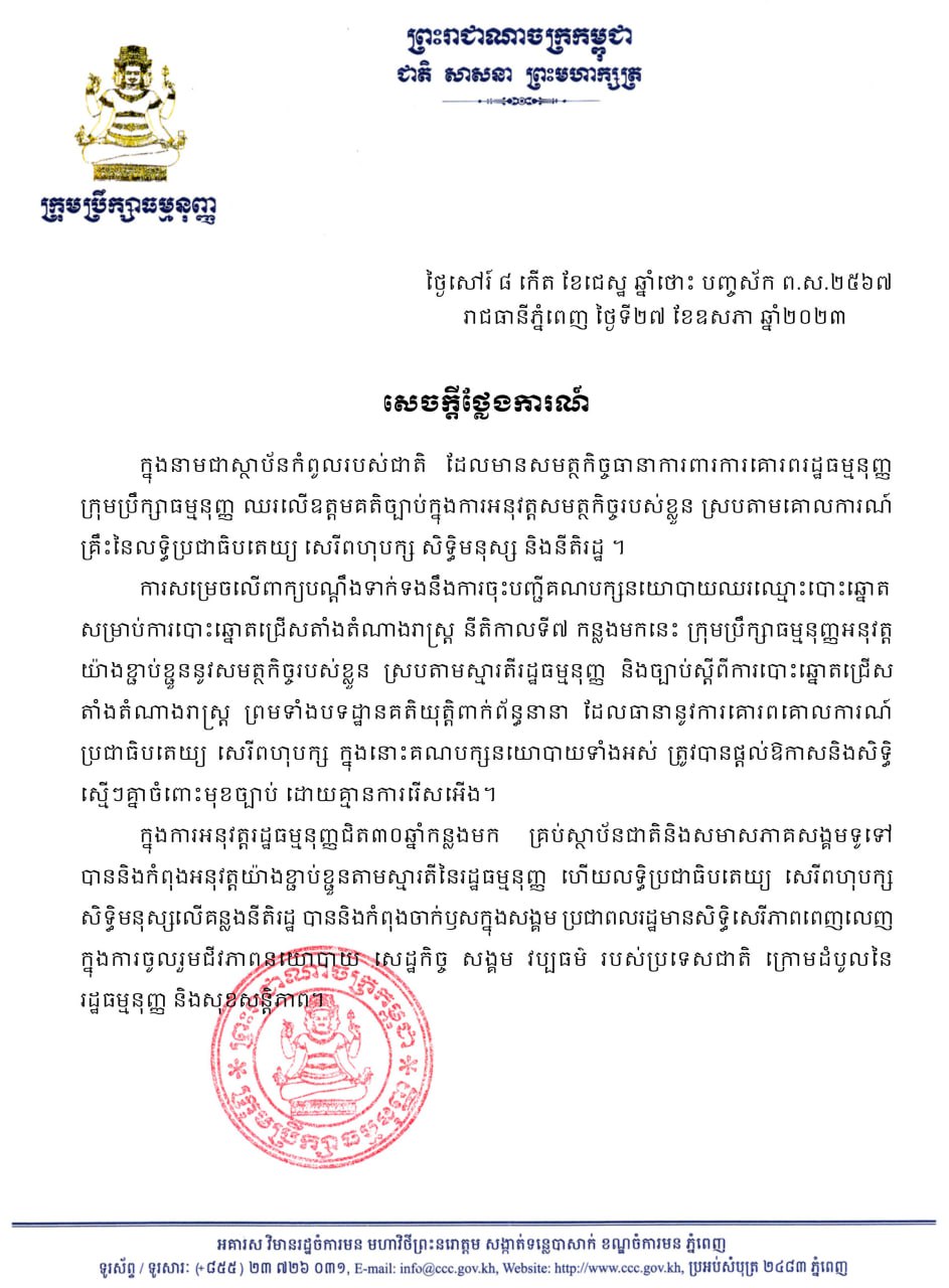 ភ្នំពេញ៖ នៅថ្ងៃទី២៧ ខែឧសភា ឆ្នាំ២០២៣នេះ ក្រុមប្រឹក្សាធម្មនុញ្ញ បានចេញសេចក្តីថ្លែងការណ៍ចាត់ទុកការបដិសេធចោលបណ្តឹងរបស់គណបក្សភ្លើងទៀន និងគណបក្សមហាសាមគ្គីជាតិខ្មែរ ទាក់ទងនឹងការចុះបញ្ជីគណបក្សនយោបាយឈរឈ្មោះបោះឆ្នោត សម្រាប់ការបោះឆ្នោតជ្រើសតាំងតំណាងរាស្រ្ត នីតិកាលទី៧កន្លងមកនេះ គឺអនុវត្តយ៉ាងខ្ជាប់ខ្ជួននូវសមត្ថកិច្ចរបស់ខ្លួន ស្របតាមស្មារតីរដ្ឋធម្មនុញ្ញ និងច្បាប់ស្តីពីការបោះឆ្នោតជ្រើសតាំងតំណាងរាស្ត្រ ព្រមទាំងបទដ្ឋានគតិយុត្តិពាក់ព័ន្ធនានា។