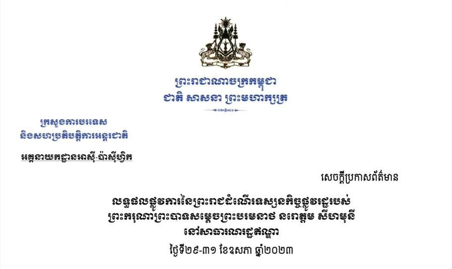សេចក្តីប្រកាសព័ត៌មានបានបញ្ជាក់ថា តបតាមការអញ្ជើញរបស់លោកជំទាវ ដ្រៅផាឌី មួរមូ ប្រធានាធិបតីនៃសាធារណរដ្ឋឥណ្ឌា ព្រះករុណា ព្រះបាទសម្តេចព្រះបរមនាថ នរោត្តម សីហមុនី ព្រះមហាក្សត្រ នៃព្រះរាជាណាចក្រកម្ពុជា បានស្តេចយាងបំពេញ ព្រះរាជទស្សនកិច្ចផ្លូវរដ្ឋ នៅសាធារណរដ្ឋឥណ្ឌា ពីថ្ងៃទី២៩ ដល់ថ្ងៃទី ៣១ ខែឧសភា ឆ្នាំ២០២៣ ដើម្បីរួមគ្នាប្រារព្ធខួបលើកទី៧០ នៃការបង្កើតទំនាក់ទំនងការទូតរវាងប្រទេសទាំងពីរ។
