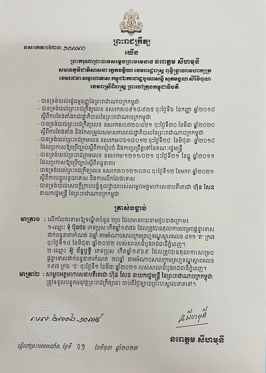ភ្នំពេញ៖ព្រះករុណាព្រះមហាក្សត្រនៃព្រះរាជាណាចក្រកម្ពុជាបានត្រាស់បង្គាប់ឱ្យលើកលែងទោសទណ្ឌិតចំនួនពីររូបគឺឈ្មោះ ទុំ ប៊ុនថន ភេទប្រុស កើតឆ្នាំ១៩៧៦ ដែលត្រូវបានតុលាការសម្រេចផ្តន្ទាទោស ដាក់ពន្ធនាគារកំណត់ ៦ឆ្នាំ តាមអំណាចសាលក្រមព្រហ្មទណ្ឌស្ថាពរលេខ ៤១១ “ត” ក្រ៧ ចុះថ្ងៃទី១៤ ខែមិថុនា ឆ្នាំ២០២២ របស់សាលាដំបូងរាជធានីភ្នំពេញនិង ឈ្មោះ អ៊ូ ច័ន្ទឫទ្ធិ ភេទប្រុស កើតឆ្នាំ១៩៦៩ ដែលត្រូវបានតុលាការសម្រេចផ្តន្ទាទោសដាក់ពន្ធនាគារកំណត់ ២០ឆ្នាំ តាមអំណាចសាលក្រមព្រហ្មទណ្ឌស្ថាពរលេខ ១៩៧ ក្រ៦ “ថ” ចុះថ្ងៃទី១ ខែមីនា ឆ្នាំ២០២១ របស់សាលាដំបូងរាជធានីភ្នំពេញ។ នេះបើយោងតាមព្រះរាជក្រឹត្យចុះថ្ងៃទី ១ខែមិថុនាឆ្នាំ២០២៣៕ដោយ៖ពលជ័យ