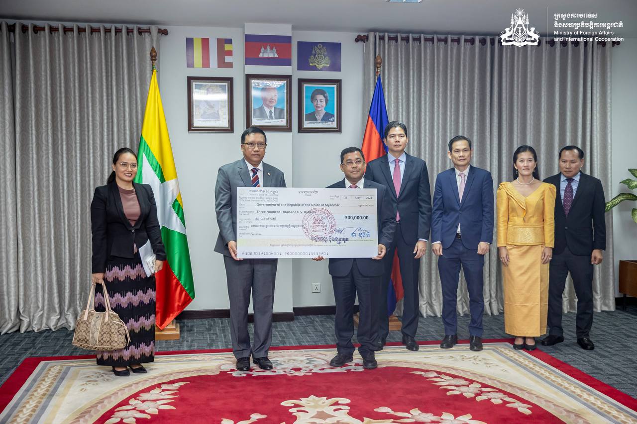 នៅក្នុងពិធីប្រគល់-ទទួល ដែលបានប្រារព្ធធ្វើនៅថ្ងៃទី២ ខែមិថុនា ឆ្នាំ២០២៣ នៅទីស្តីការក្រសួង ដោយមានវត្តមានចូលរួមរបស់ឯកឧត្តម អ៊ូ ធីត លីញអូន ឯកអគ្គរដ្ឋទូតនៃសាធារណរដ្ឋ សហភាពមីយ៉ាន់ម៉ា ប្រចាំព្រះរាជាណាចក្រកម្ពុជា ឯកឧត្តមបណ្ឌិត ញឹម ខេមរា រដ្ឋលេខាធិការនៃក្រសួងការបរទេស និងសហប្រតិបត្តិការអន្តរជាតិ បានចូលរួមរំលែកទុក្ខយ៉ាងជ្រាលជ្រៅបំផុតចំពោះផលប៉ះពាល់យ៉ាងធ្ងន់ធ្ងរដល់អាយុជីវិត និងទ្រព្យសម្បត្តិរបស់ប្រជាជនមីយ៉ាន់ម៉ា ហើយសង្ឃឹមថា មីយ៉ាន់ម៉ានឹងអាចជម្នះស្ថានភាពដ៏លំបាកនេះ បានឆាប់រហ័ស។ កាយវិការសប្បុរសធម៌ខាងលើឆ្លុះបញ្ចាំងពីគុណតម្លៃនៃមនុស្សជាតិ ព្រមទាំងចំណងមិត្តភាពនិងសាមគ្គីភាពរបស់ព្រះរាជាណាចក្រកម្ពុជា ជាមួយសាធារណរដ្ឋសហភាពមីយ៉ាន់ម៉ា ដែលកំពុងស្ថិតក្នុងស្ថានភាពដ៏លំបាក សំដៅរួមចំណែកជួយសម្រួលដល់ដំណើរការស្តារប្រទេសឡើងវិញ។