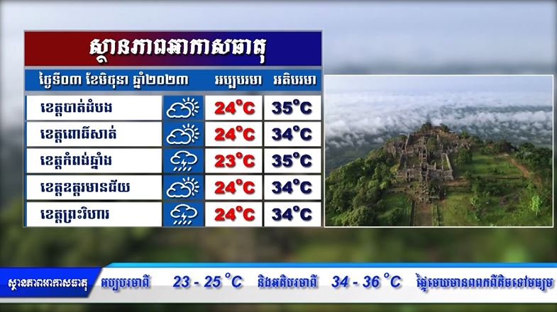 ព្យាករណ៍អាកាសធាតុ សម្រាប់ថ្ងៃទី០៣ មិថុនា ២០២៣ (មានវីដេអូ)