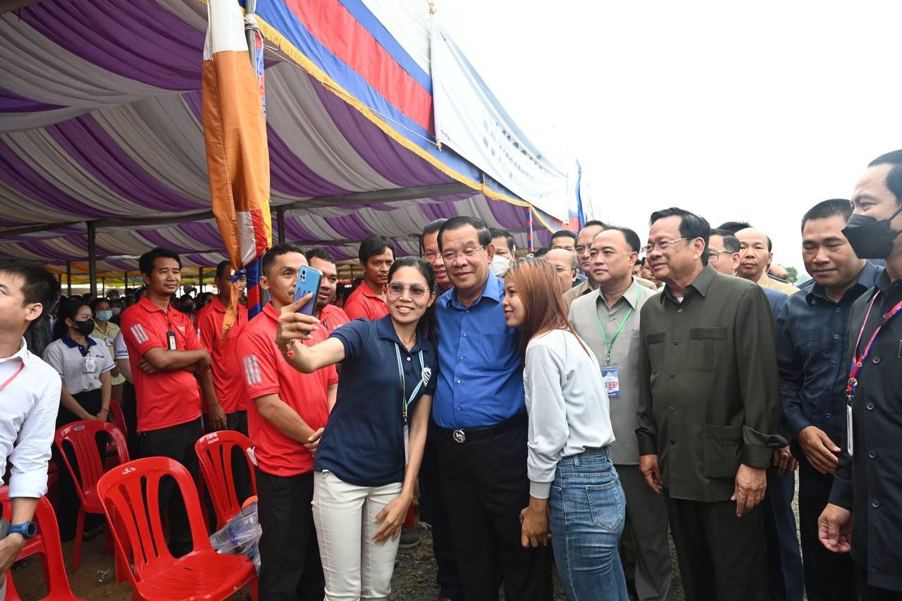 កណ្ដាល៖ សម្តេចអគ្គមហាសេនាបតីតេជោ ហ៊ុន សែន នាយករដ្ឋមន្ត្រី នៃព្រះរាជាណាចក្រកម្ពុជា អញ្ជើញសួរសុខទុក្ខ និងសំណេះសំណាលជាមួយបងប្អូនកម្មករនិយោជិត នៅក្នុងសួនឧស្សាហកម្មខេមតុន (CAMTON INDUSTRIAL PARK) មកពីរោងចក សហគ្រាសចំនួន១៩ នៅព្រឹកថ្ងៃសៅរ៍ ទី៣ ខែមិថុនា ឆ្នាំ២០២៣ ។