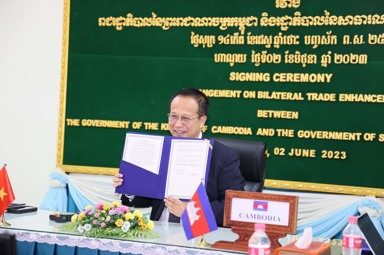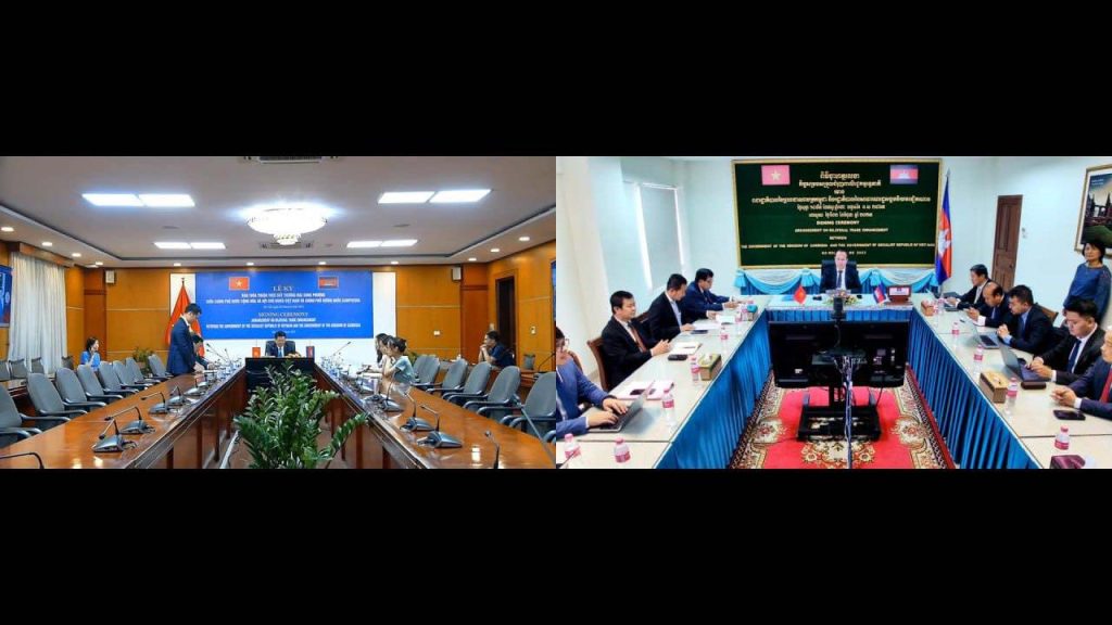 ពិធីចុះហត្ថលេខាបានប្រារព្ធរសៀលថ្ងៃទី០២ ខែមិថុនា ឆ្នាំ២០២៣តាមរយៈប្រព័ន្ធវីដេអូ រវាងឯកឧត្តម លោក ប៉ាន សូរស័ក្តិ រដ្ឋមន្ត្រីក្រសួងពាណិជ្ជកម្ម និងជាតំណាងរាជរដ្ឋាភិបាលកម្ពុជា ខណៈភាគីវៀតណាមតំណាងដោយឯកឧត្តម ង្វៀន ហុងទៀន (NGUYEN HONG DIEN) រដ្ឋមន្ត្រីក្រសួងឧស្សាហកម្មនិងពាណិជ្ជកម្ម និងមានការអញ្ជើញចូលរួមថ្នាក់ដឹកនាំ និងមន្រ្តីជំនាញពាក់ព័ន្ធនៃក្រសួងទាំងពីរផងដែរ។