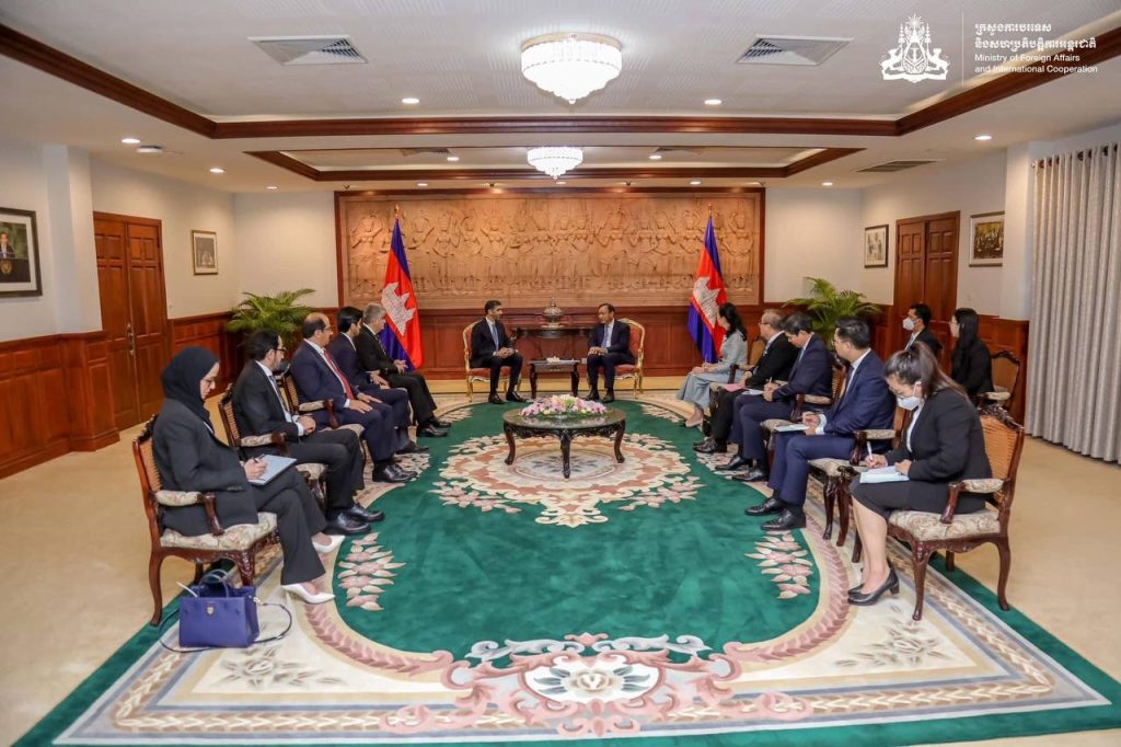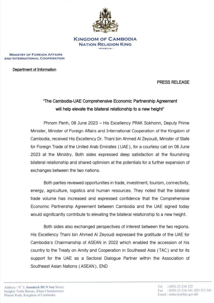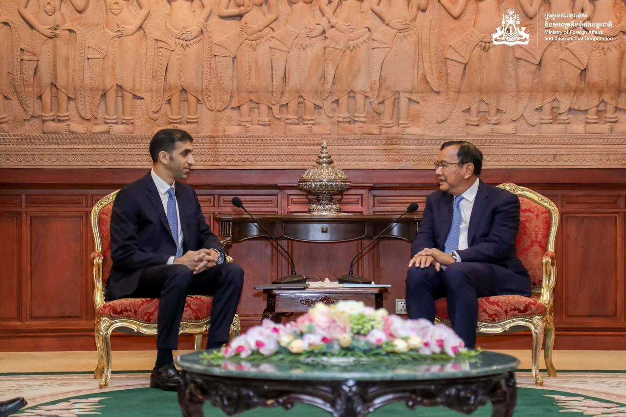 ភ្នំពេញ៖ ឯកឧត្តម ឧបនាយករដ្ឋមន្ត្រី ប្រាក់ សុខុន រដ្ឋមន្ត្រីការបរទេស និងសហប្រតិបត្តិការអន្តរជាតិ នៃព្រះរាជាណាចក្រកម្ពុជា បានទទួលជួបលោកបណ្ឌិត ថានី ប៊ីន អាម៉េត អាល់ ហ្សេយូឌី (Thani bin Ahmed Al Zeyoudi) រដ្ឋមន្រ្ដីពាណិជ្ជកម្មអន្តរជាតិនៃប្រទេសអេមីរ៉ាតអារ៉ាប់រួម ដែលចូលសម្តែងការគួរសម នៅទីស្តីការក្រសួង នៅថ្ងៃទី៨ ខែមិថុនា ឆ្នាំ២០២៣។ ភាគីទាំងពីរបានសម្តែងនូវការពេញចិត្តយ៉ាងខ្លាំងចំពោះទំនាក់ទំនងទ្វេភាគីដែលកំពុងរីកលូតលាស់ និងមានសុទិដ្ឋិនិយមចំពោះសក្តានុពលសម្រាប់ការពង្រីកបន្ថែមទៀតនូវការផ្លាស់ប្តូរវាងប្រទេសទាំងពីរ។