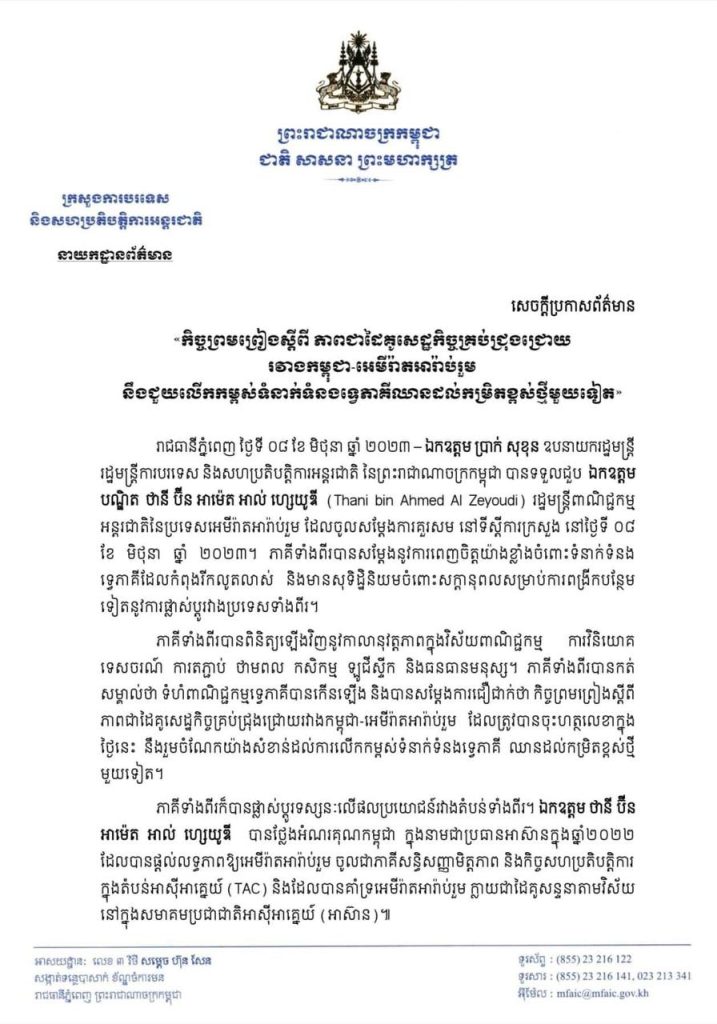កិច្ចព្រមព្រៀងស្ដីពីភាពជាដៃគូសេដ្ឋកិច្ចគ្រប់ជ្រុងជ្រោយរវាងកម្ពុជា-អេមីរ៉ាតអារ៉ាប់រួម នឹងជួយលើកកម្ពស់ទំនាក់ទំនងទ្វេភាគីឈានដល់កម្រិតខ្ពស់ថ្មីមួយទៀត