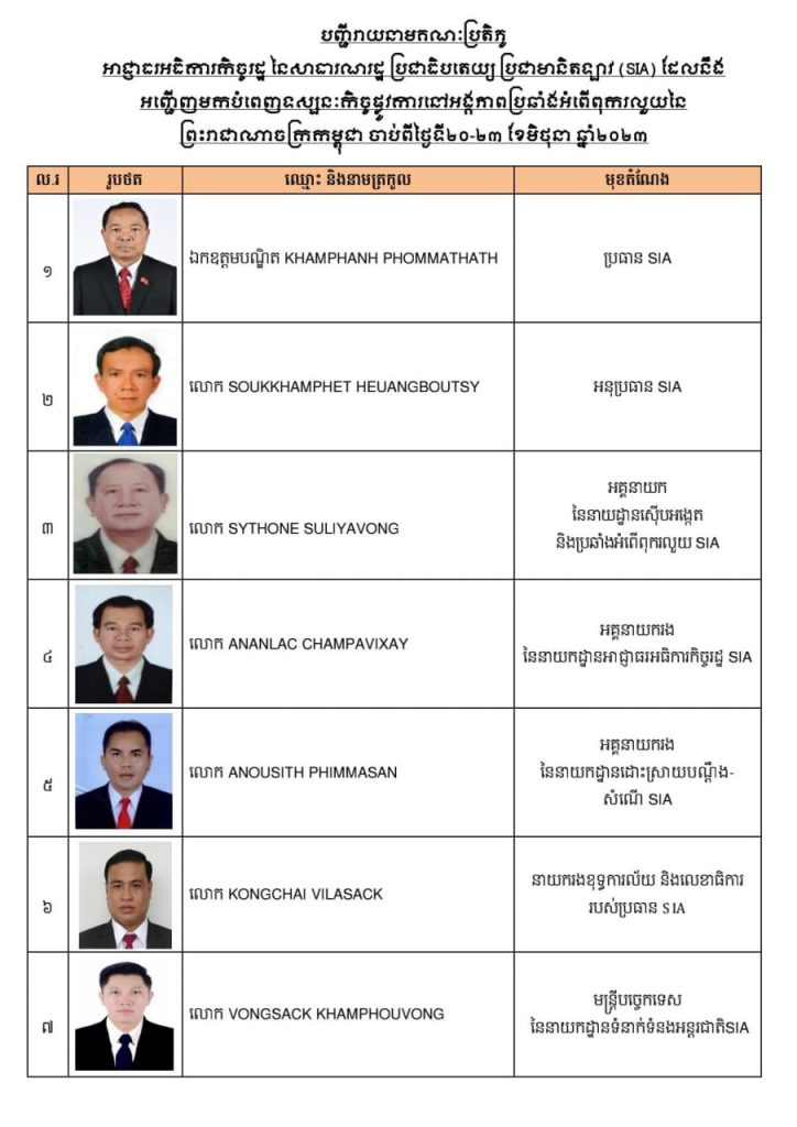ដំណើរបំពេញទស្សនកិច្ចរបស់គណៈប្រតិភូអាជ្ញាធរអធិការកិច្ចរដ្ឋឡាវនេះ ធ្វើឡើងបន្ទាប់ពីមានការអញ្ជើញពីឯកឧត្តម ឱម យិនទៀង ទេសរដ្ឋមន្ត្រី ប្រធានអង្គភាពប្រឆាំងអំពើពុករលួយរបស់កម្ពុជា (អ.ប.ព.) ដែលគណៈប្រតិភូឡាវនេះមានចំនួនប្រាំមួយរូប ដឹកនាំដោយឯកឧត្តម ខាំផាន់ ផុមម៉ះថាត់(KHAMPHANH PHOMMATHATH) ប្រធានអាជ្ញាធរអធិការកិច្ចរដ្ឋឡាវ។ នេះបើតាមយោងតាមសេចក្តីប្រកាសរបស់ អង្គភាពប្រឆាំងអំពើពុករលួយរបស់កម្ពុជា (អ.ប.ព.) ចុះថ្ងៃទី១៩ ខែមិថុនា។