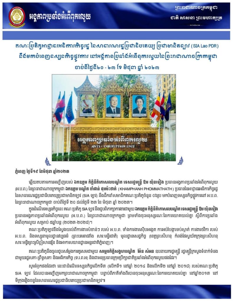 អ.ប.ព. បានបញ្ជាក់ថា ដំណើរទស្សនកិច្ចរបស់គណៈប្រតិភូឡាវនេះប្រព្រឹត្តទៅរយៈពេលបី ថ្ងៃ ចាប់ពីថ្ងៃទី២០ ដល់ថ្ងៃទី២៣ ខែមិថុនា ឆ្នាំ២០២៣ ហើយអង្គភាព SIA ឡាវ និងអង្គភាពអ.ប.ព. នឹងចុះអនុស្សរណៈយោគយល់ជាមួយគ្នា ស្តីពីការប្រឆាំងអំពើពុករលួយសម្រាប់ ៥ឆ្នាំបន្ត ពីឆ្នាំ២០២៣ ដល់ឆ្នាំ២០២៨ផងដែរ។