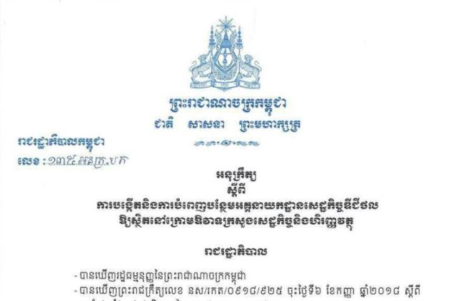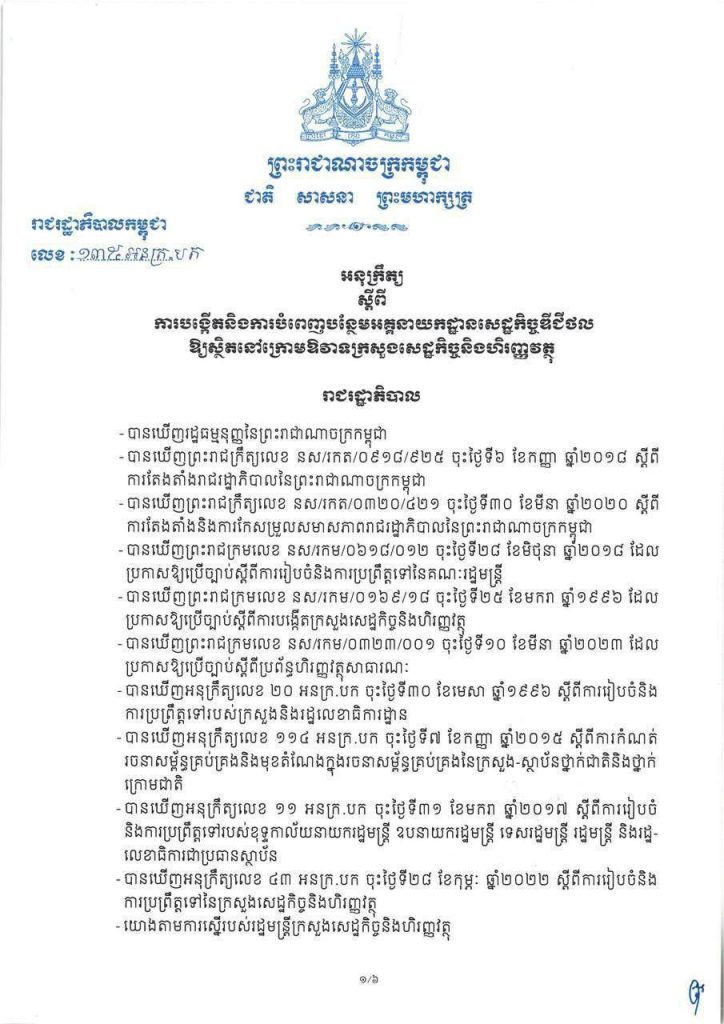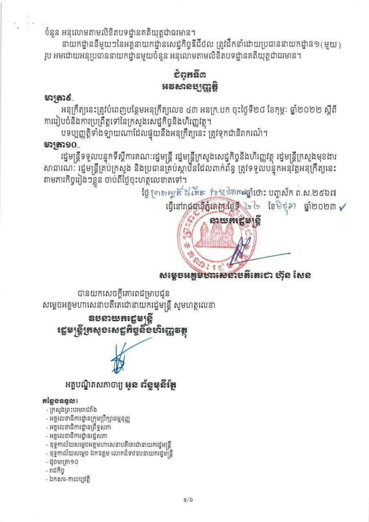 ក្នុងអនុក្រឹត្យដែលចុះហត្ថលេខាដោយសម្ដេចអគ្គមហាសេនាបតីតេជោ ហ៊ុន សែន នាយករដ្ឋមន្រ្តីកម្ពុជា ចុះថ្ងៃទី ២២ខែមិថុនា ឆ្នាំ ២០២៣ មាន ៣ជំពូក និង ១០ មាត្រា ដែលបានចែងពី បេសកកម្ម តួនាទី ភារកិច្ច និងរចនាសម្ព័ន្ធ។
