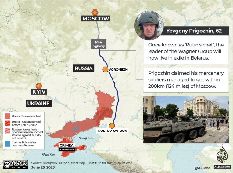 បន្ទាប់មកនៅព្រឹកថ្ងៃសៅរ៍ ទាហានស៊ីឈ្នួលវ៉ាក់ណែ បានឆ្លងកាត់ព្រំដែនពីជំរុំរបស់ខ្លួននៅអ៊ុយក្រែន ចូលទៅក្នុងទីក្រុងរុស្ស៊ីភាគខាងត្បូង Rostov-on-Don។ ក្នុងការវិវត្តន៍នៃស្ថានការណ៍តានតឹងដ៏រហ័ស គេបានរាយការណ៍ថា ក្រុមទាហាននេះបានចូលកាន់កាប់បញ្ជាការយោធាក្នុងតំបន់ បន្ទាប់មកបានរឹបអូសយកទីតាំងយោធាក្នុងក្រុងមួយទៀត គឺក្រុង Voronezh (ចម្ងាយប្រមាណជាង ៥៦០ គីឡូម៉ែត្រពីក្រុងRostov-on-Don ) នៅពេលធ្វើការដង្ហែក្បួនឆ្ពោះទៅក្រុងមូស្គូ។