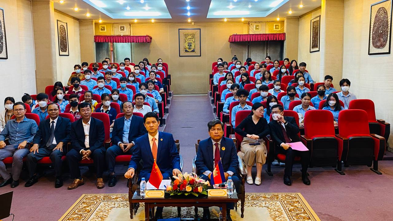 ភ្នំពេញ៖ ក្រោមការគាំទ្រពីស្ថានទូតចិនប្រចាំកម្ពុជា សាកលវិទ្យាល័យភូមិន្ទ វិចិត្រសិល្បៈនិងសមាគមអ្នកស្រាវជ្រាវវឌ្ឍនភាពកម្ពុជា-ចិន បានសហការ រៀបចំកម្មវិធីតុមូលស្តីពីកិច្ចកសាងសហគមន៍ជោគវាសនារួមនៃមនុស្សជាតិជំរុញនិងលើកទឹកចិត្តដល់ការកសាងសន្តិភាពនិងការអភិវឌ្ឍរបស់ពិភពលោកកាលពីរសៀលថ្ងៃទី២៦ ខែមិថុនា ឆ្នាំ២០២៣ ។វាគ្មិនកម្ពុជាបួនរូប វាគ្មិនចិនចំនួនមួយរូបនិង អ្នកចូលរួម ចំនួន១២០នាក់បានចូលរួមក្នុងកម្មវិធី នេះ។