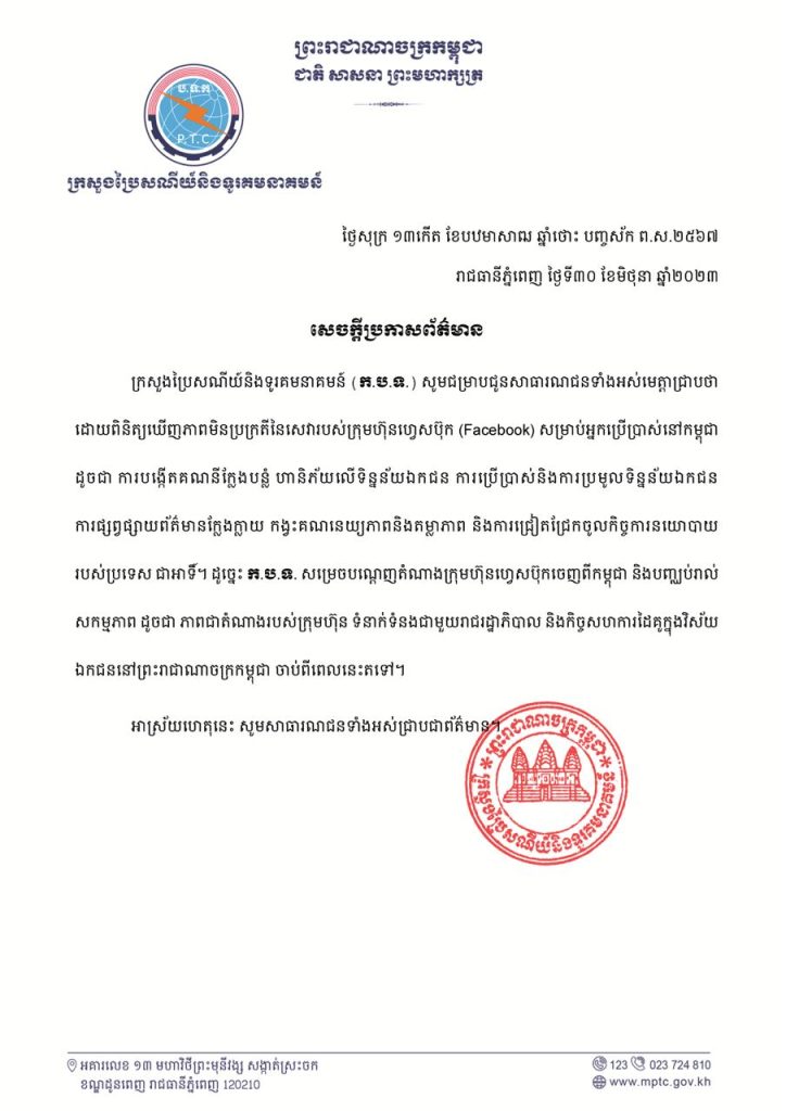 ភ្នំពញ៖ ក្រសួងប្រៃសណីយ៍និងទូរគមនាគមន៍ (ក.ប.ទ.) សូមជម្រាបជូនសាធារណជនទាំងអស់មេត្តាជ្រាបថា ដោយពិនិត្យឃើញភាព មិន ប្រក្រតី នៃសេវារបស់ក្រុមហ៊ុន ហ្វេសប៊ុក (Facebook) សម្រាប់ អ្នក ប្រើប្រាស់នៅកម្ពុជា ដូចជា ការបង្កើតគណនីក្លែងបន្លំ ហានិភ័យលើទិន្នន័យឯកជន ការប្រើប្រាស់ និង ការប្រមូល ទិន្នន័យ ឯកជន ការផ្សព្វផ្សាយ ព័ត៌មានក្លែងក្លាយ កង្វះគណនេយ្យភាព និងតម្លាភាព និង ការជ្រៀតជ្រែក ចូលកិច្ចការនយោបាយរបស់ប្រទេសជាអាទិ៍។
