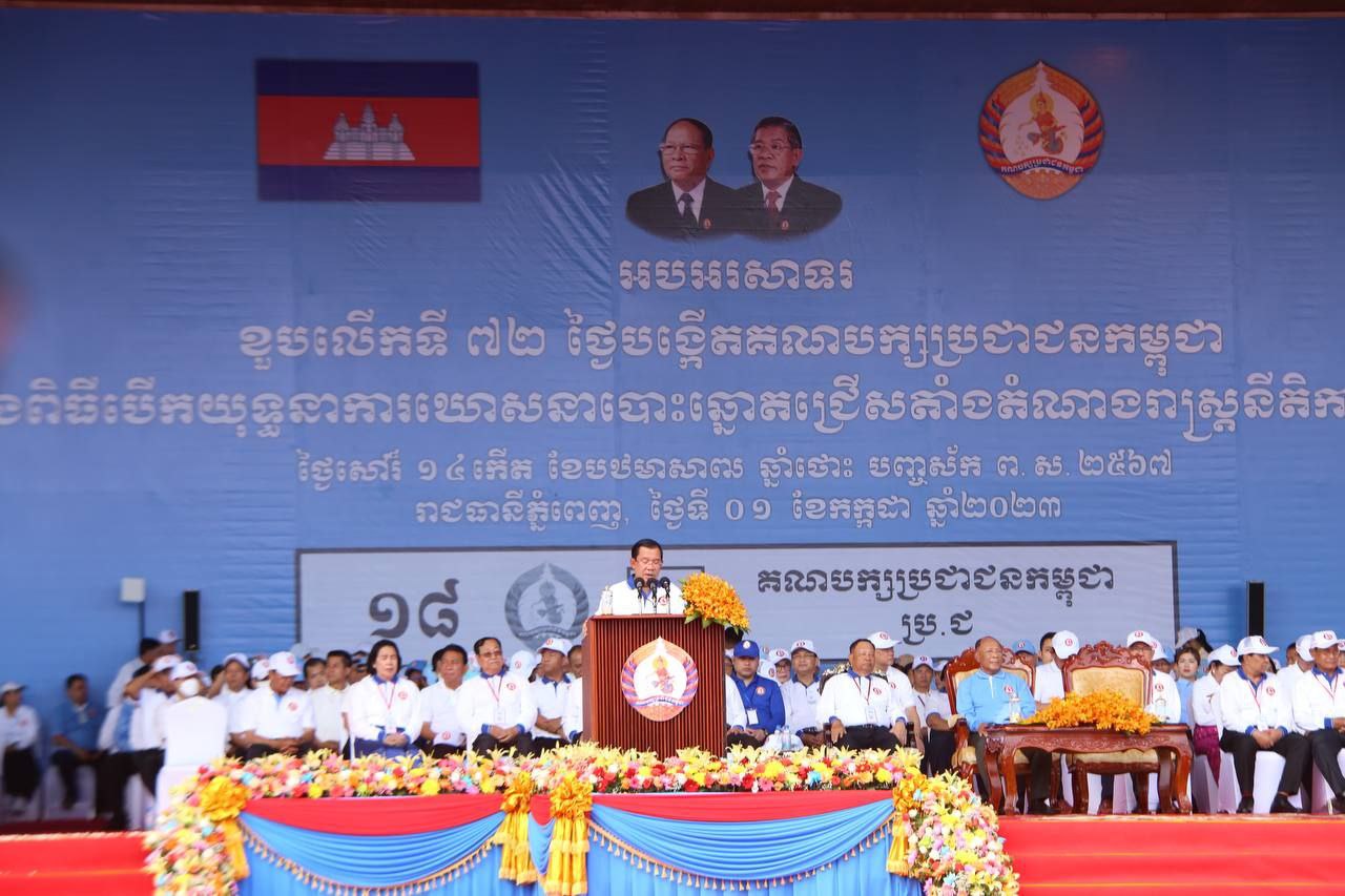 ភ្នំពេញ៖ ក្នុងឱកាសអញ្ជើញជាអធិបតីក្នុងមីទ្ទិញអបអរសាទរខួបអនុស្សាវរីយ៍លើកទី ៧២ ថ្ងៃបង្កើតគណបក្សប្រជាជនកម្ពុជា និងពិធីបើកយុទ្ធនាការឃោសនាបោះឆ្នោតជ្រើសតាំងតំណាងរាស្ត្រនីតិកាលទី ៧ នាព្រឹកថ្ងៃទី០១ ខែកក្កដា ឆ្នាំ២០២៣ នៅមុខសាលមហោស្រពកោះពេជ្រ សម្តេចតេជោ ហ៊ុន សែន ប្រធានគណបក្សប្រជាជនកម្ពុជា បានថ្លែងថា នៅក្នុងនីតិកាលទី៦ នៃរដ្ឋសភា រាជរដ្ឋាភិបាលដឹកនាំដោយគណបក្សប្រជាជនកម្ពុជា ដែលមានរូបសម្ដេចជានាយករដ្ឋមន្ត្រី បានការពារយ៉ាងរឹងមាំនូវសន្តិភាព ស្ថិរភាព សន្តិសុខ និងសណ្ដាប់ធ្នាប់សង្គម ដែលបានធានាដល់ការរស់នៅដ៏សុខសាន្ដរបស់ប្រជាជន ការអភិវឌ្ឍសេដ្ឋកិច្ច សង្គម និងការពង្រឹងពង្រីកប្រជាធិបតេយ្យ។