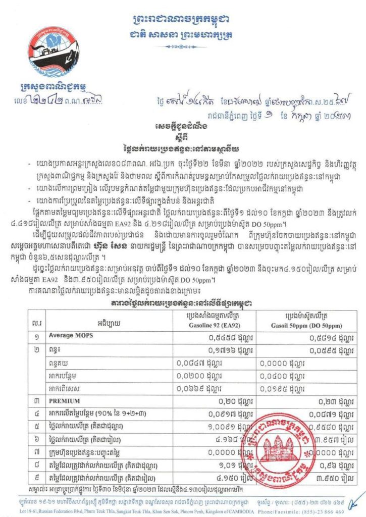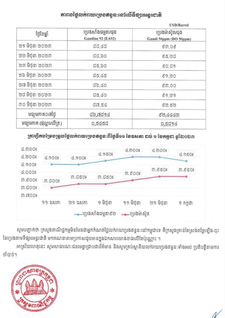 នៅក្នុងសេចក្តីជូនដំណឹងរបស់ក្រសួង បានបញ្ជាក់បន្ថែមថា ផ្អែកតាមតម្លៃមធ្យមប្រេងឥន្ធនៈ លើទីផ្សារអន្តរជាតិ ថ្លៃលក់រាយប្រេងឥន្ធនៈ ចាប់ពីថ្ងៃទី ០១ ដល់ ថ្ងៃទី១០ ខែកក្កដា ឆ្នាំ ២០២៣ នឹងត្រូវ លក់ ៤.៤១៨រៀល ក្នុង ១ លីត្រ សម្រាប់ ប្រេងសាំង ធម្មតា EA92 និង ៤.២១៨រៀល ក្នុង ១លីត្រ សម្រាប់ ប្រេងម៉ាស៊ូត DO50ppm។