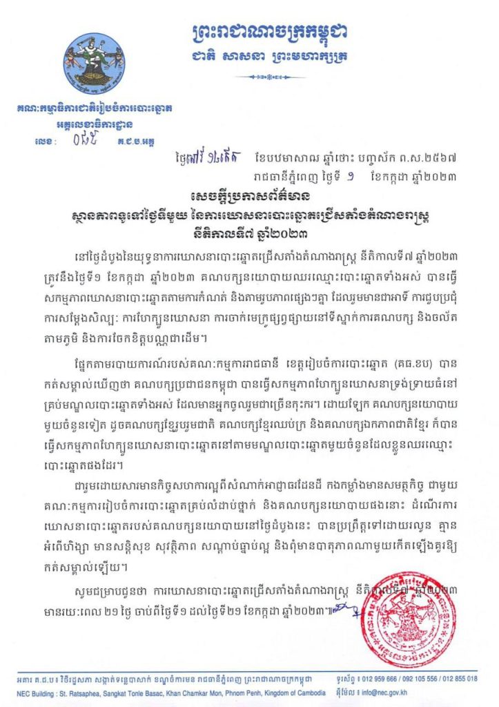 ភ្នំពេញ៖ នៅថ្ងៃដំបូងនៃយុទ្ធនាការឃោសនាបោះឆ្នោតជ្រើសតាំងតំណាងរាស្ត្រ នីតិកាលទី៧ ឆ្នាំ២០២៣ ត្រូវនឹងថ្ងៃទី១ ខែកក្កដា ឆ្នាំ២០២៣ គណបក្សនយោបាយឈរឈ្មោះបោះឆ្នោតទាំងអស់ បានធ្វើសកម្មភាពឃោសនាបោះឆ្នោតតាមការកំណត់ និងតាមរូបភាពផ្សេងៗគ្នា ដែលរួមមានជាអាទិ៍ ការជួបប្រជុំ ការសម្ដែងសិល្បៈ ការហែក្បួនឃោសនា ការចាក់មេក្រូផ្សព្វផ្សាយនៅទីស្នាក់ការគណបក្ស និងចល័ត តាមភូមិ និងការចែកខិត្តបណ្ណជាដើម។ នេះបើយោងតាមសេចក្តីប្រកាសព័ត៌មានរបស់ គ.ជ.ប នៅល្ងាចថ្ងៃទី១ ខែកក្កដា ឆ្នាំ២០២៣នេះ។