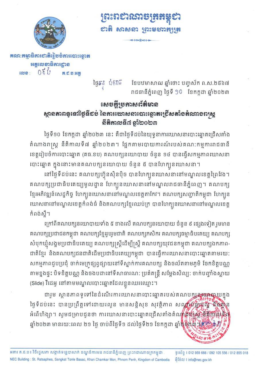 ជារួម ស្ថានភាពទូទៅនៃដំណើរការឃោសនាបោះឆ្នោតរបស់គណបក្សនយោបាយក្នុងថ្ងៃទីដប់នេះ បានប្រព្រឹត្តទៅដោយរលូន មានសន្តិសុខ សុវត្ថិភាព សណ្ដាប់ធ្នាប់ល្អ និងគ្មានអំពើហិង្សា។ សូមជម្រាបថា ការឃោសនាបោះឆ្នោតជ្រើសតាំងតំណាងរាស្រ្ត នីតិកាលទី៧ ឆ្នាំ២០២៣ មានរយៈពេល ២១ ថ្ងៃ ចាប់ពីថ្ងៃទី១ ដល់ថ្ងៃទី២១ ខែកក្កដា ឆ្នាំ២០២៣៕