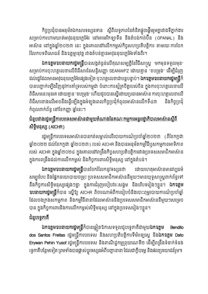 ចំណែកក្នុងកិច្ចប្រជុំគណៈកម្មការតំបន់អាស៊ីអាគ្នេយ៍គ្មានអាវុធនុយក្លេអ៊ែរ (SEANWFZ) ក្រសួងការបរទេស បានបញ្ជាក់ថា កិច្ចប្រជុំបានប្តេជ្ញាចិត្តសារជាថ្មីចំពោះការរក្សាតំបន់អាស៊ីអាគ្នេយ៍ជាតំបន់គ្មានអាវុធនុយក្លេអ៊ែរ និងគ្មានអាវុធមហាប្រល័យផ្សេងទៀត ដូចបានកំណត់នៅក្នុងធម្មនុញ្ញអាស៊ាន និងសន្ធិសញ្ញា SEANWFZ ហើយ ក៏បានសង្កត់ធ្ងន់ទៅលើសារៈសំខាន់នៃការអនុវត្តសន្ធិសញ្ញានេះ រួមទាំងការអនុវត្តផែនការសកម្មភាព (២០២៣-២០២៧) ឱ្យបានពេញលេញ និងប្រកបដោយប្រសិទ្ធភាព។ កិច្ចប្រជុំបានអនុម័តឯកសារទស្សនទាន ស្តីពីលទ្ធភាពនៃគំនិតផ្តួចផ្តើមរួមគ្នារវាងទីភ្នាក់ងារសម្រាប់ការហាមឃាត់អាវុធនុយក្លេអ៊ែរ នៅអាមេរិកឡាទីន និងតំបន់ការ៉ាប៊ីន (OPANAL) និងអាស៊ាន នៅក្នុងឆ្នាំ២០២៣ នេះ ក្នុងគោលដៅលើកកម្ពស់កិច្ចសហប្រតិបត្តិការ តាមរយៈការចែករំលែកបទពិសោធន៍ និងឧត្តម្មានុវត្ត រវាងតំបន់គ្មានអាវុធនុយក្លេអ៊ែរទាំងពីរ។