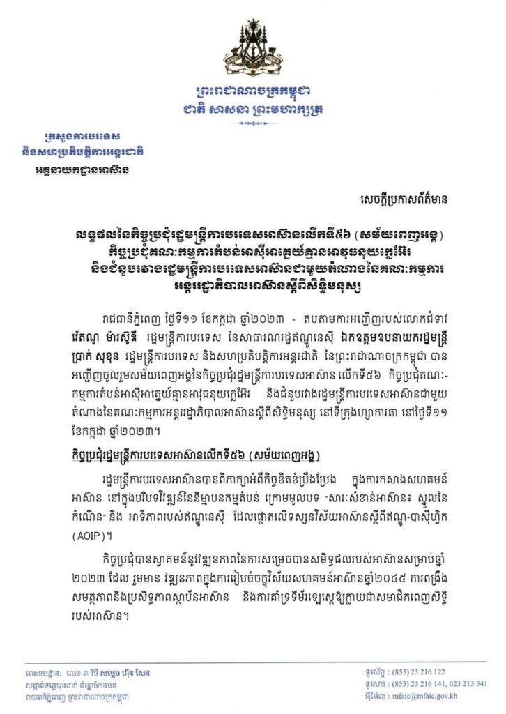 លទ្ធផលនៃកិច្ចប្រជុំរដ្ឋមន្រ្តីការបរទេសអាស៊ានលើកទី៥៦ (សម័យពេញអង្គ) កិច្ចប្រជុំគណៈកម្មការតំបន់អាស៊ី អាគ្នេយ៍ គ្មានអាវុធនុយក្លេអ៊ែរ និងជំនួបរវាងរដ្ឋមន្រ្តីការបរទេសអាស៊ានជាមួយ តំណាងនៃគណៈកម្មការអន្តររដ្ឋាភិបាលអាស៊ានស្តីពីសិទ្ធិមនុស្ស