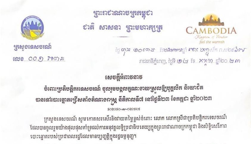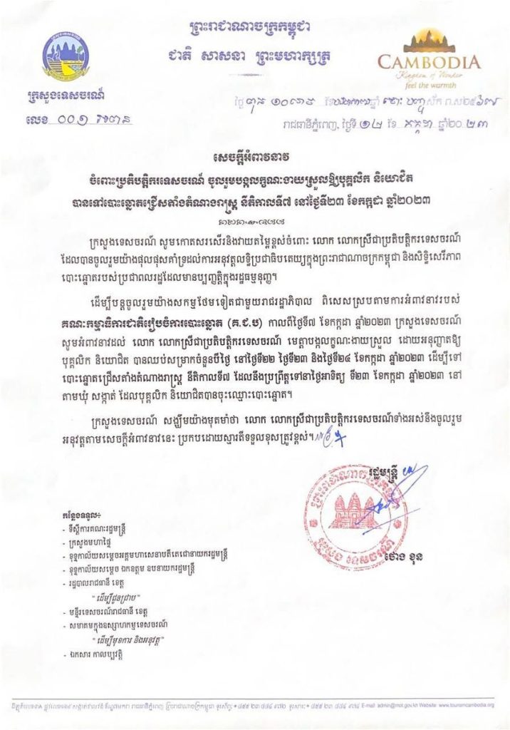 តាមរយៈលិខិតអំពាវនាវ ឯកឧត្តម ថោង ខុន នៅថ្ងៃទី១២ ខែកក្កដា បានលើកឡើងថា ៖ «ដើម្បីបន្តចូលរួមយ៉ាងសកម្មថែមទៀតជាមួយរាជរដ្ឋាភិបាល ពិសេសស្របតាមការអំពាវនាវរបស់ គ.ជ.ប ក្រសួងទេសចរណ៍ សូមអំពាវនាវដល់ប្រតិបត្តិករទេសចរណ៍ មេត្តាបង្កលក្ខណៈងាយស្រួល ដោយអនុញ្ញាតឱ្យបុគ្គលិក និយោជិត បានឈប់សម្រាកចំនួនបីថ្ងៃ នៅថ្ងៃទី២២-២៣ និងទី២៤ ខែកក្កដា ដើម្បីទៅបោះឆ្នោតនៅតាមឃុំ សង្កាត់ដែលបានចុះឈ្មោះ»។