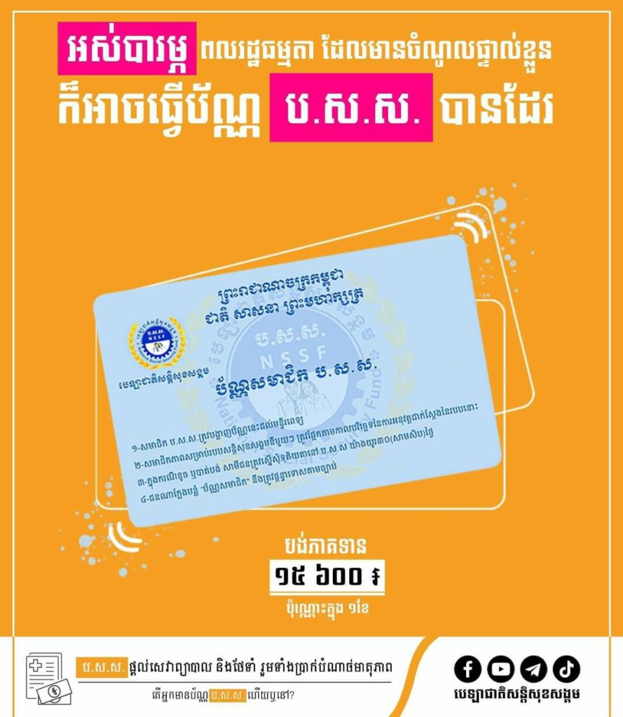 ក្នុងសារនេះដែរ ឯកឧត្តមរដ្ឋមន្រ្តីក្រសួងការងារបានបញ្ជាក់ថា”អស់បារម្ភ! សម្រាប់បងប្អូនអាជីវករ អ្នករត់ម៉ូតូឌុប រត់កង់បី និងបងប្អូនអ្នករកចំណូលផ្ទាល់ខ្លួនគ្រប់ប្រភេទ ក៏អាចមកស្នើសុំធ្វើប័ណ្ណ ប.ស.ស. បានដែរតាមរយៈរបបភាគទានដោយស្ម័គ្រចិត្ត”។