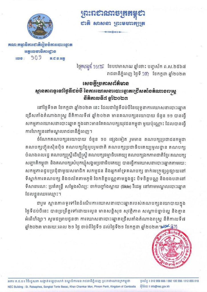 គ.ជ.ប បានបញ្ជាក់ថា ជារួម ស្ថានភាពទូទៅនៃដំណើរការឃោសនាបោះឆ្នោតរបស់គណបក្សនយោបាយក្នុងថ្ងៃទីដប់បីនេះ បានប្រព្រឹត្តទៅដោយរលូន មានសន្តិសុខ សុវត្ថិភាព សណ្ដាប់ធ្នាប់ល្អ និងគ្មានអំពើហិង្សា។ សូមជម្រាបជូនថា ការឃោសនាបោះឆ្នោតជ្រើសតាំងតំណាងរាស្រ្ត នីតិកាលទី៧ ឆ្នាំ២០២៣ មានរយៈពេល២១ថ្ងៃ ចាប់ពីថ្ងៃទី១ ដល់ថ្ងៃទី២១ ខែកក្កដា ឆ្នាំ២០២៣៕
