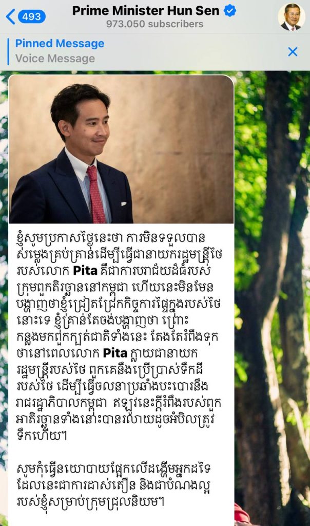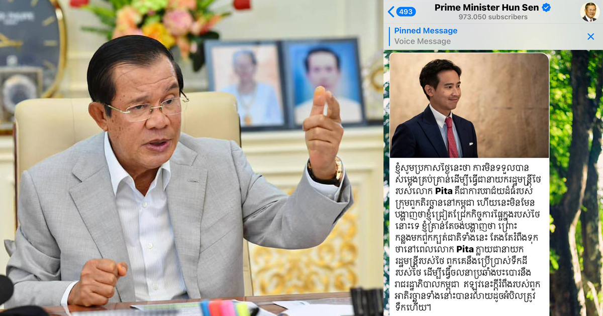 សម្តេចតេជោ ហ៊ុន សែន បានសរសេរនៅលើបណ្តាញតេឡេក្រាមថា ៖“ខ្ញុំសូមប្រកាសថ្ងៃនេះថា ការមិនទទួលបានសំឡេងគ្រប់គ្រាន់ដើម្បីធ្វើជានាយករដ្ឋមន្រ្តីថៃរបស់លោក Pita គឺជាការបរាជ័យដ៏ធំរបស់ក្រុមពួកតិរច្ឆាននៅកម្ពុជា ហើយនេះមិនមែនបង្ហាញថាខ្ញុំជ្រៀតជ្រែកកិច្ចការផ្ទៃក្នុងរបស់ថៃនោះទេ ខ្ញុំគ្រាន់តែចង់បង្ហាញថា ព្រោះកន្លងមកពួកក្បត់ជាតិទាំងនេះ តែងតែរំពឹងទុកថានៅពេលលោក Pita ក្លាយជានាយករដ្ឋមន្រ្តីរបស់ថៃ ពួកគេនឹងប្រើប្រាស់ទឹកដីរបស់ថៃ ដើម្បីធ្វើចលនាប្រឆាំងបះបោរនឹងរាជរដ្ឋាភិបាលកម្ពុជា ឥឡូវនេះក្តីរំពឹងរបស់ពួកអាតិរច្ឆានទាំងនោះបានរលាយដូចអំបិលត្រូវទឹកហើយ។ សូមកុំធ្វើនយោបាយផ្អែកលើដង្ហើមអ្នកដទៃ ដែលនេះជាការដាស់តឿន និងជាបំណងល្អរបស់ខ្ញុំសម្រាប់ក្រុមជ្រុលនិយម”៕