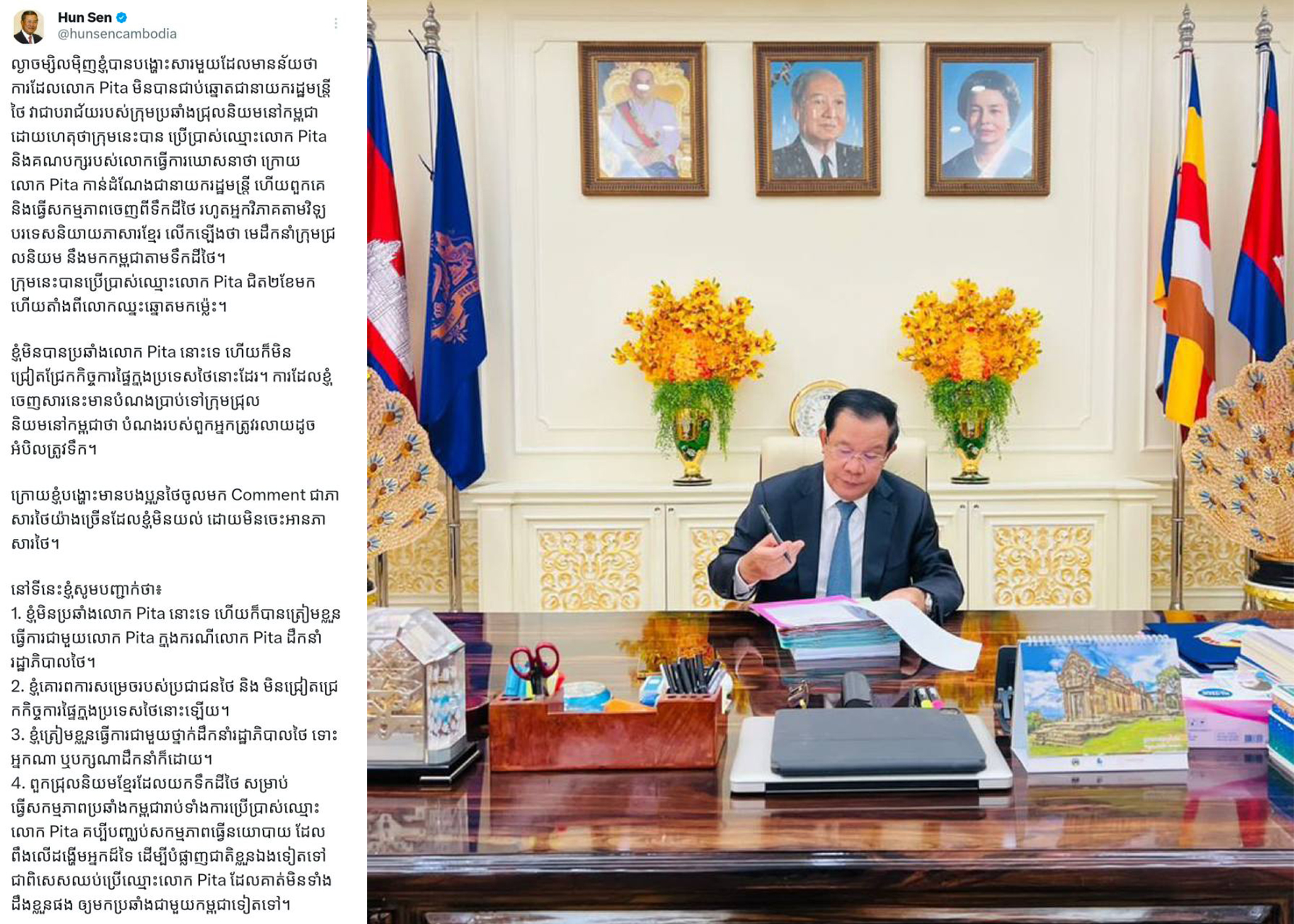 សម្តេចតេជោ ហ៊ុន សែន : ខ្ញុំមិនប្រឆាំងលោក Pita នោះទេ ហើយក៏បានត្រៀមខ្លួនធ្វើការជាមួយលោក Pita ក្នុងករណីលោក Pita ដឹកនាំរដ្ឋាភិបាលថៃ