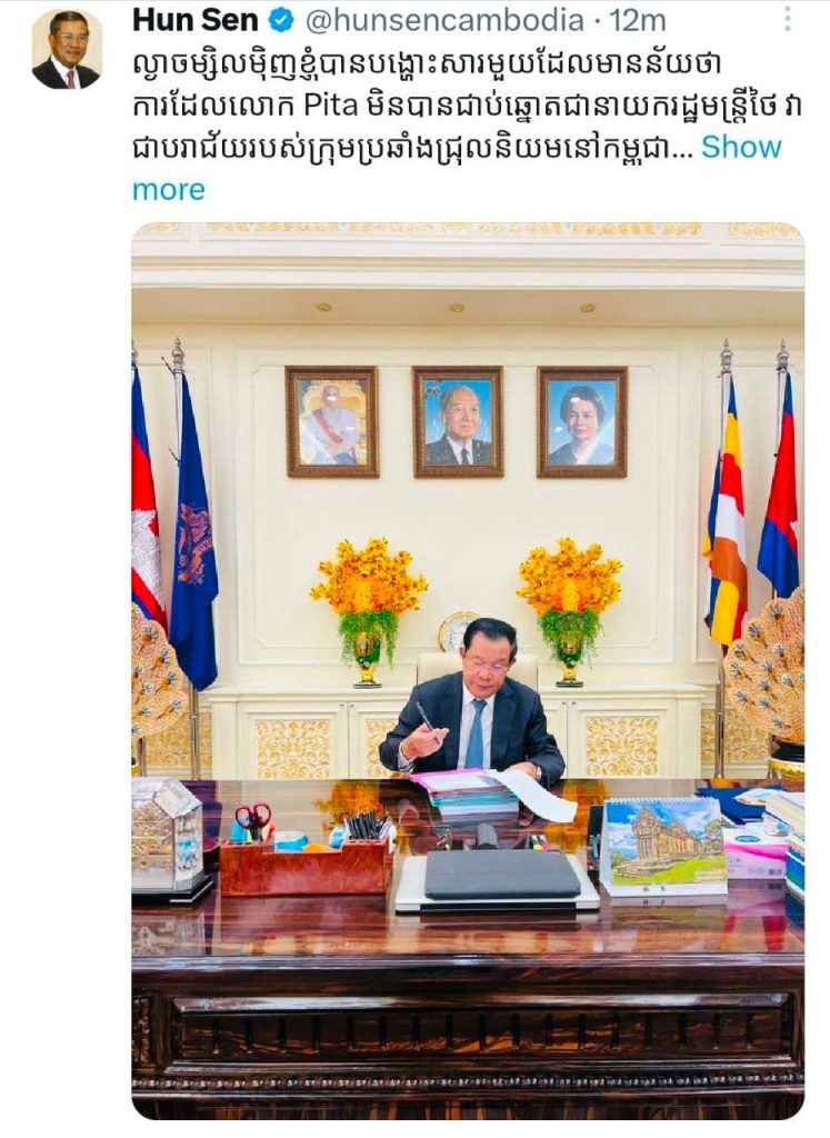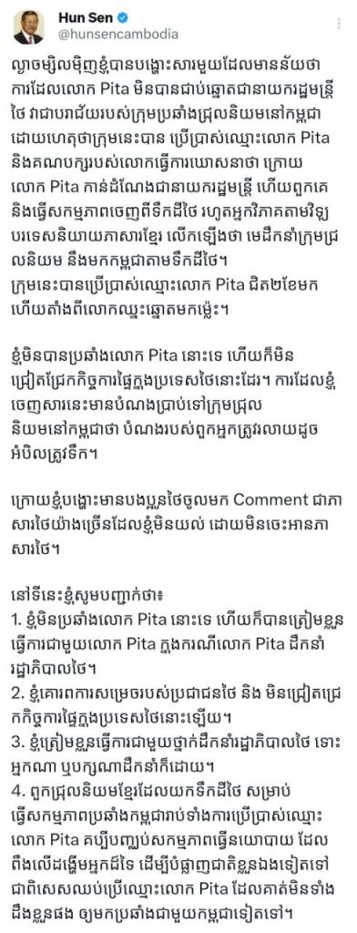 សម្ដេចតេជោ បានបញ្ជាក់ដូច្នេះថា៖ ល្ងាចម្សិលមិញ ខ្ញុំបានបង្ហោះសារមួយ ដែលមានន័យថា ការដែលលោក Pita មិនបានជាប់ឆ្នោតជានាយករដ្ឋមន្ត្រីថៃ វាជាបរាជ័យរបស់ក្រុមប្រឆាំងជ្រុលនិយមនៅកម្ពុជា ដោយហេតុថា ក្រុមនេះបានប្រើប្រាស់ឈ្មោះលោក Pita និងគណបក្សរបស់លោក ធ្វើការឃោសនាថា ក្រោយលោក Pita កាន់ដំណែងជានាយករដ្ឋមន្ត្រីហើយ ពួកគេនិងធ្វើសកម្មភាពចេញពីទឹកដីថៃ រហូតអ្នកវិភាគតាមវិទ្យុបរទេសនិយាយភាសារខ្មែរ លើកឡើងថា មេដឹកនាំក្រុមជ្រលនិយម នឹងមកកម្ពុជា តាមទឹកដីថៃ។ ក្រុមនេះ បានប្រើប្រាស់ឈ្មោះលោក Pita ជិត ២ខែមកហើយ តាំងពីលោកឈ្នះឆ្នោតមកម្ល៉េះ។