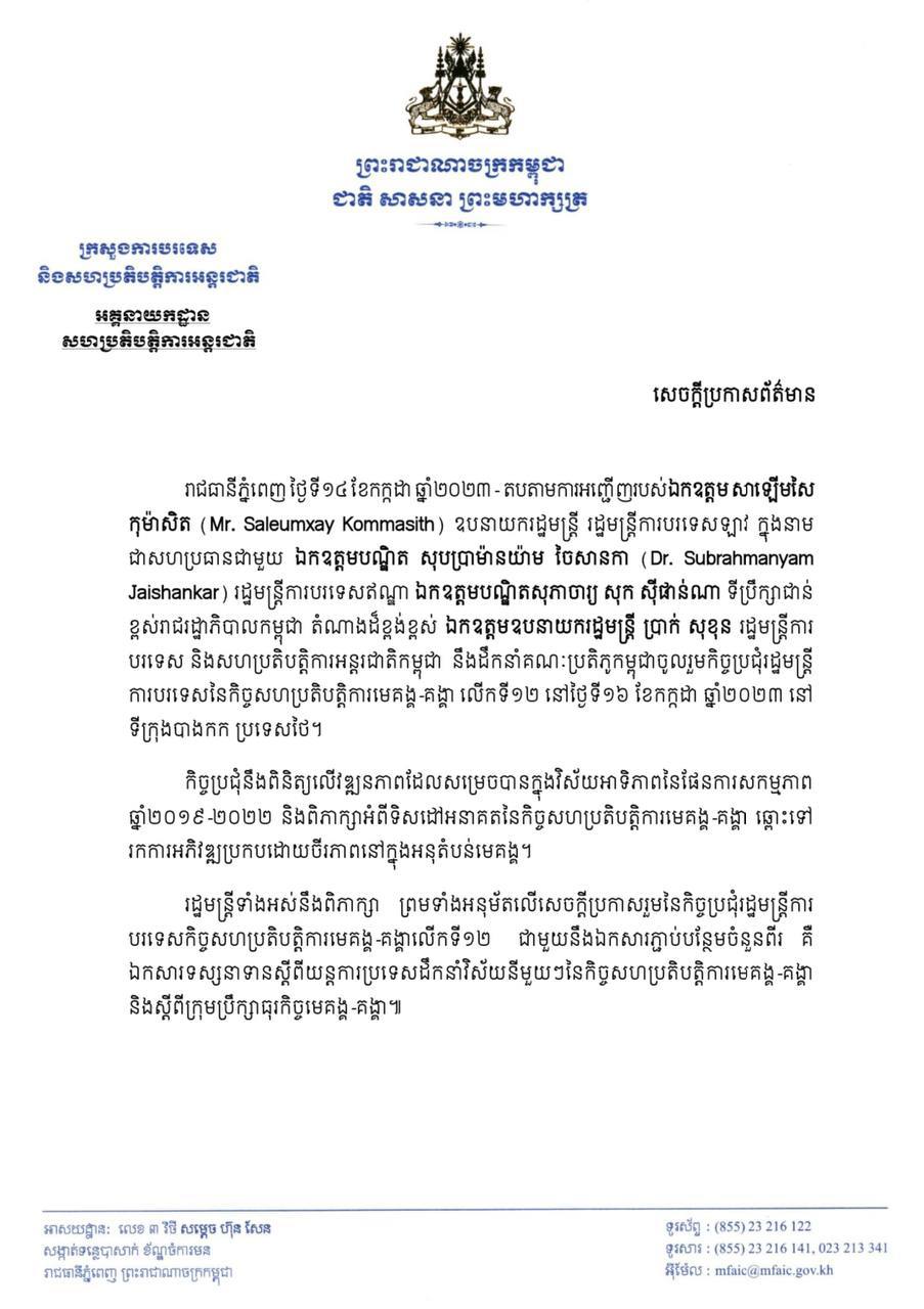 តបតាមការអញ្ជើញរបស់ឯកឧត្តម សាឡើមស កុម៉ាសិត (Mr. Saleumxay Kommasith) ឧបនាយករដ្ឋមន្ត្រី រដ្ឋមន្ត្រីការបរទេសឡាវ ក្នុងនាមជាសហប្រធានជាមួយ ឯកឧត្តមបណ្ឌិត សុបប្រាម៉ានយ៉ាម ចៃសាន (Dr. Subrahmanyam Jaishankar) រដ្ឋមន្ត្រីការបរទេសឥណ្ឌា ឯកឧត្ដមបណ្ឌិតសុភាចារ្យ សុក ស៊ីផាន់ណា ទីប្រឹក្សាជាន់ខ្ពស់រាជរដ្ឋាភិបាលកម្ពុជា តំណាងដ៏ខ្ពង់ខ្ពស់ឯកឧត្តមឧបនាយករដ្ឋមន្ត្រី ប្រាក់ សុខុន រដ្ឋមន្ត្រីការបរទេស និងសហប្រតិបត្តិការអន្តរជាតិកម្ពុជា នឹងដឹកនាំគណៈប្រតិភូកម្ពុជាចូលរួមកិច្ចប្រជុំរដ្ឋមន្ត្រី ការបរទេសនៃកិច្ចសហប្រតិបត្តិការមេគង្គ-គង្គា លើកទី១២ នៅថ្ងៃទី១៦ ខែកក្កដា ឆ្នាំ២០២៣ នៅទីក្រុងបាងកក ប្រទេសថៃ។