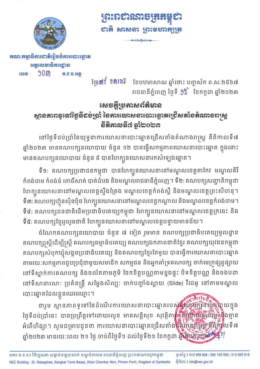 ជារួម ស្ថានភាពទូទៅនៃដំណើរការឃោសនាបោះឆ្នោតរបស់គណបក្សនយោបាយក្នុងថ្ងៃទីដប់ប្រាំនេះ បានប្រព្រឹត្តទៅដោយរលូន មានសន្តិសុខ សុវត្ថិភាព សណ្ដាប់ធ្នាប់ល្អ និងគ្មានអំពើហិង្សា។ សូមជម្រាបថា ការឃោសនាបោះឆ្នោតជ្រើសតាំងតំណាងរាស្រ្ត នីតិកាលទី៧ ឆ្នាំ២០២៣ មានរយៈពេល ២១ ថ្ងៃ ចាប់ពីថ្ងៃទី១ ដល់ថ្ងៃទី២១ ខែកក្កដា ឆ្នាំ២០២៣។ ការបោះឆ្នោតជ្រើសតាំងតំណាងរាស្ត្រ និងប្រព្រឹត្តទៅនៅថ្ងៃទី២៣ ខែកក្កដា ខាងមុខនេះ ដោយមានគណពក្សនយោបាយចំនួន ១៨ បានចុះបញ្ជីចូលរួមប្រកួតប្រជែង៕